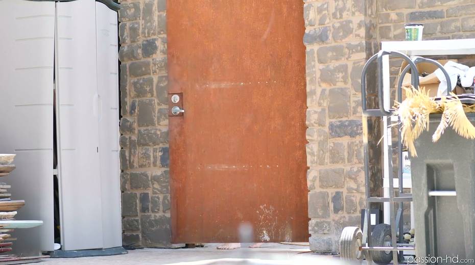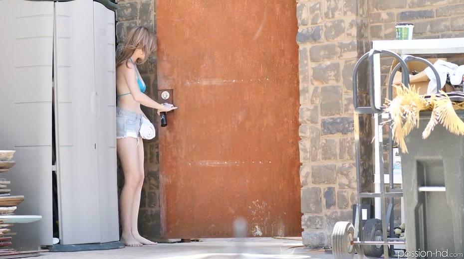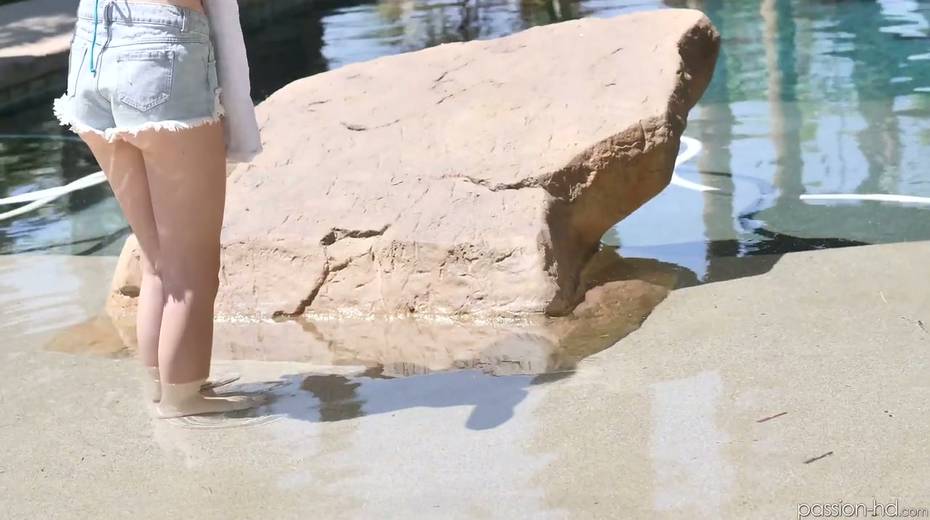 Dude is hitting on nude babe Mia Collins masturbating by the poolside