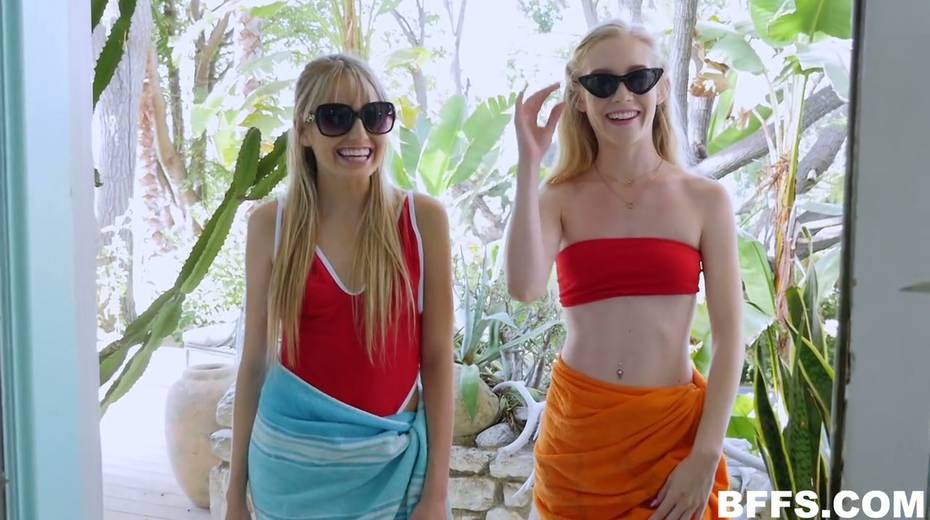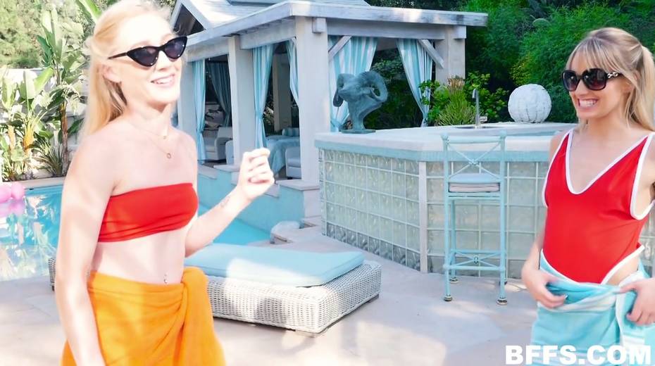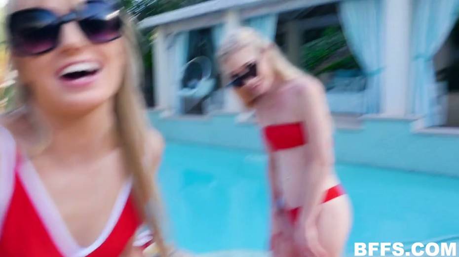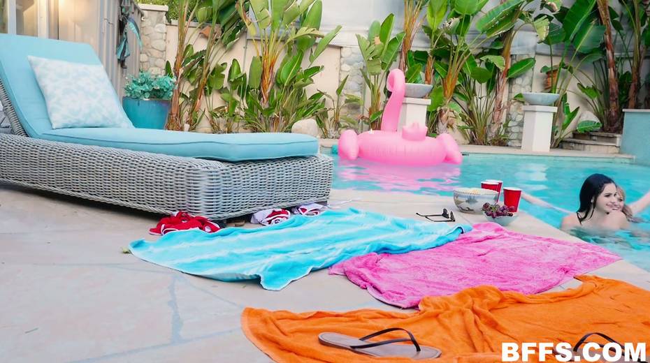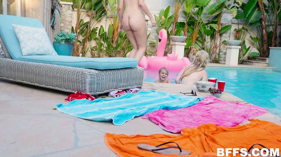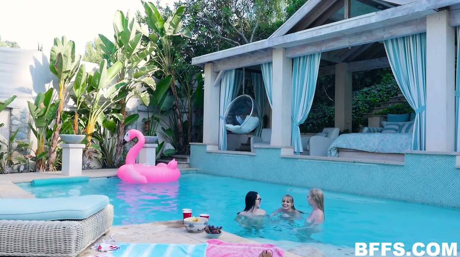 Three oversexed lesbian babes lick each others pussies by the poolside