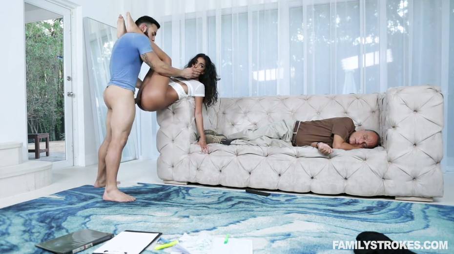 Horny stepbrother fucks sexy stepsis Claire Black in front of sleeping stepdad