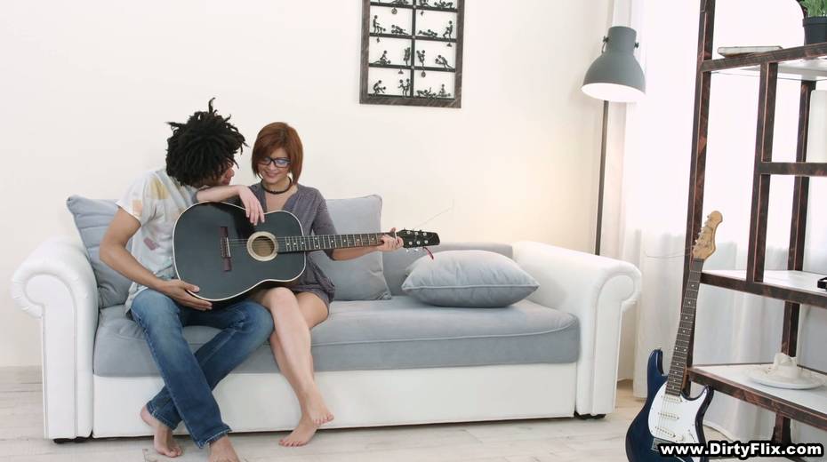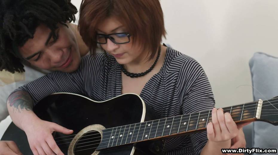 Shy red head in glasses Rebecca Rainbow is fucked by handsome guitar teacher