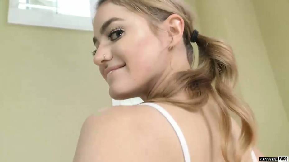 Cute blonde with pigtails Kenzie Madison gives a rimjob and gets laid