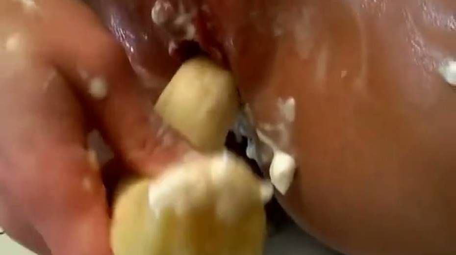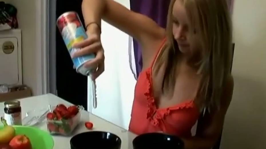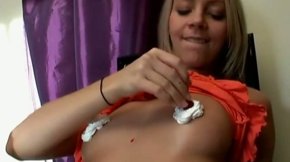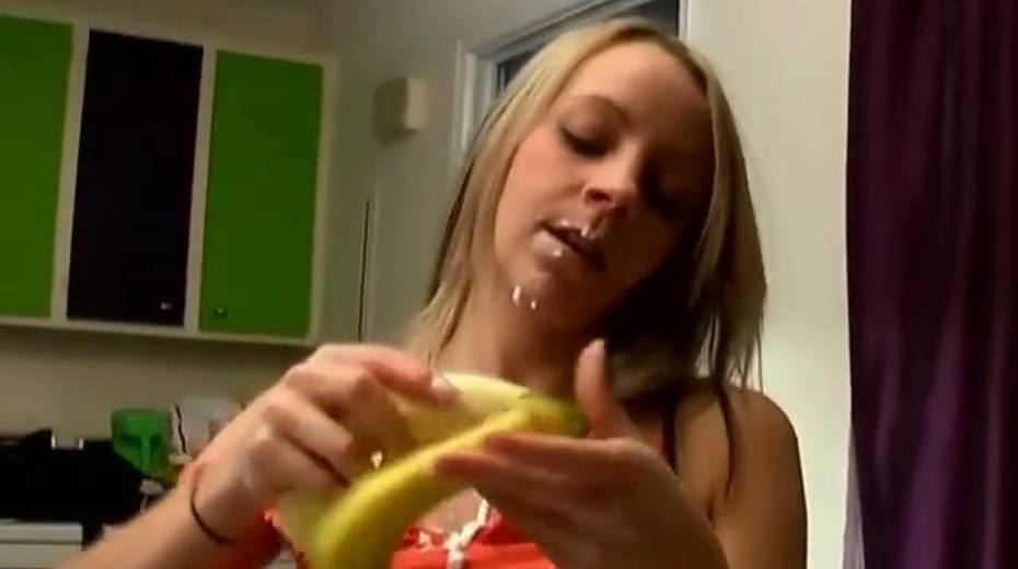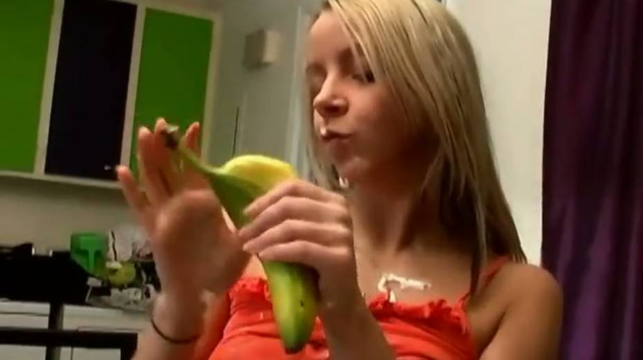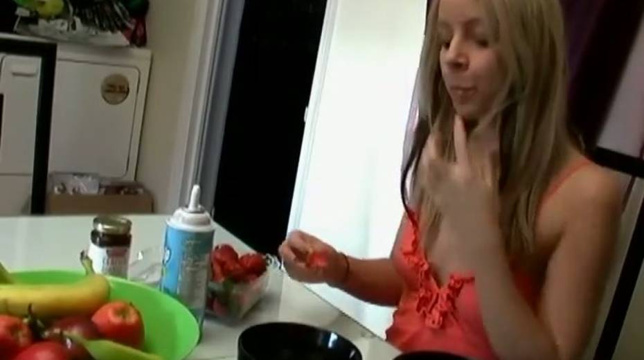 Crazy chick Candy Kiss fucks her pussy with banana covered with whipped cream