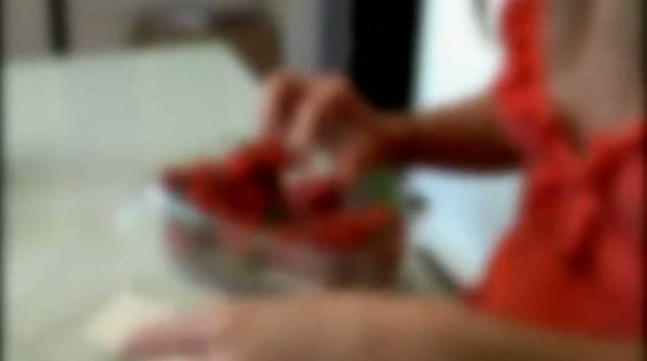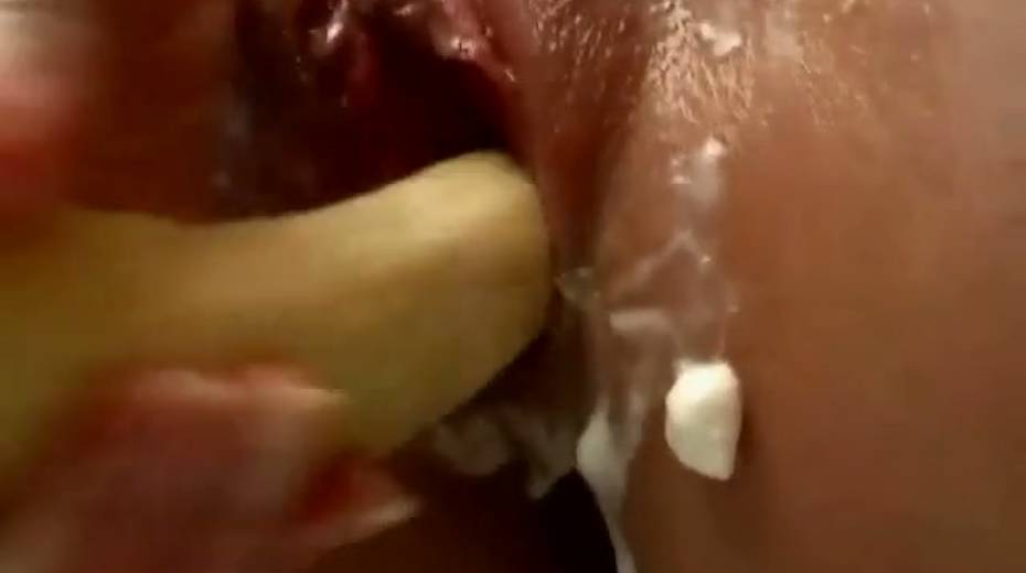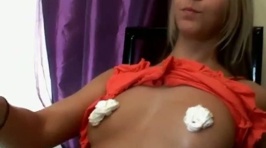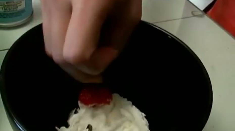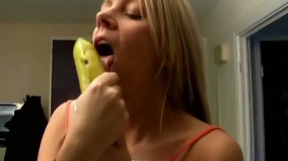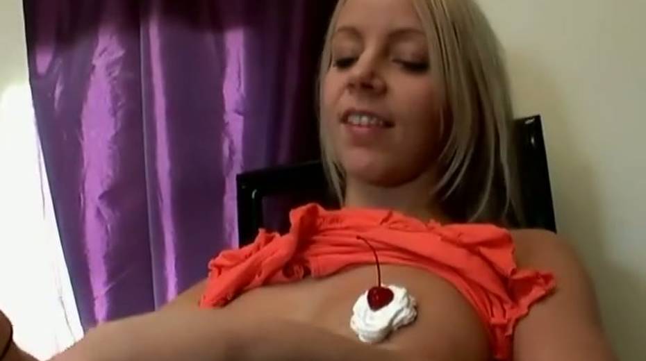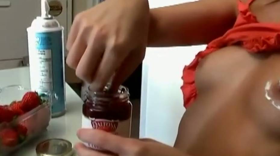 Crazy chick Candy Kiss fucks her pussy with banana covered with whipped cream