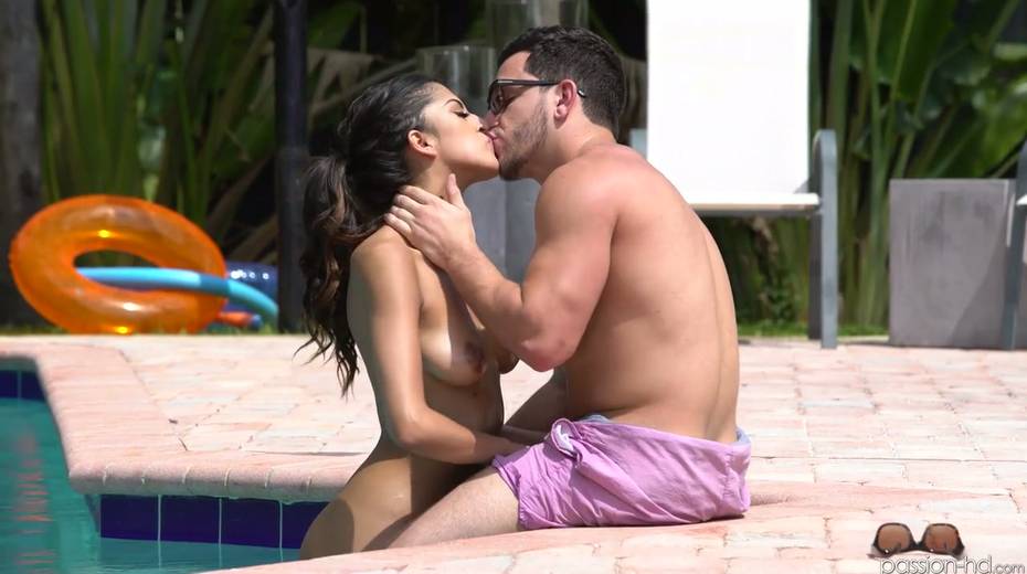 Charming tanned hottie Sophia Leone gets laid by the poolside and on the grass