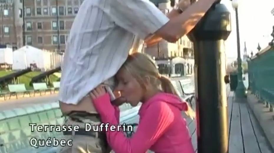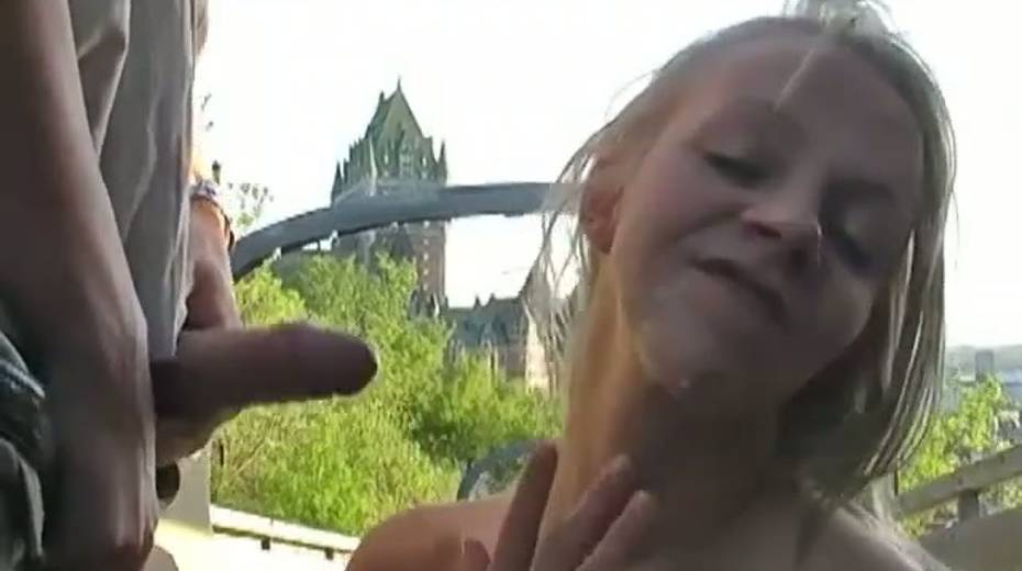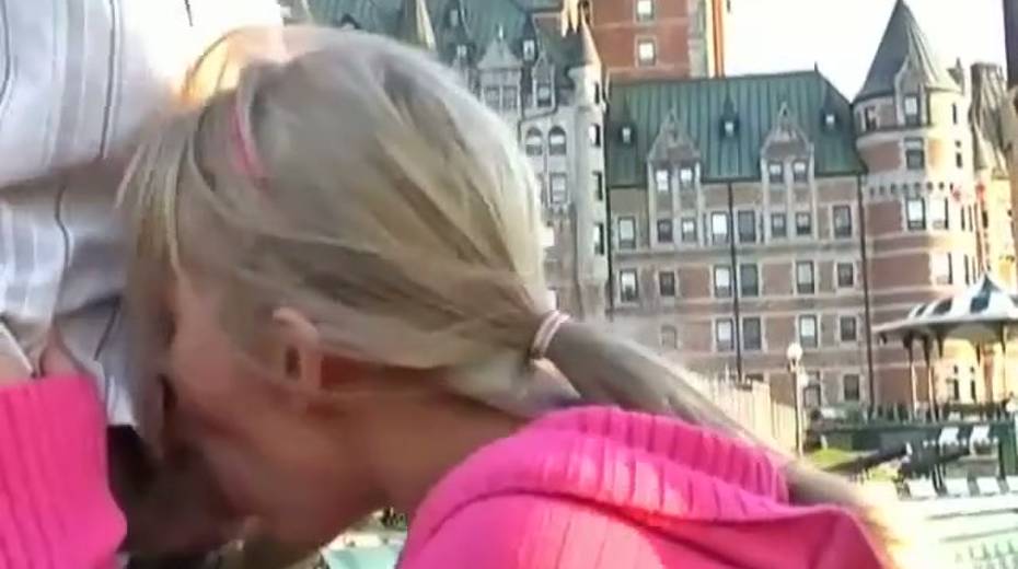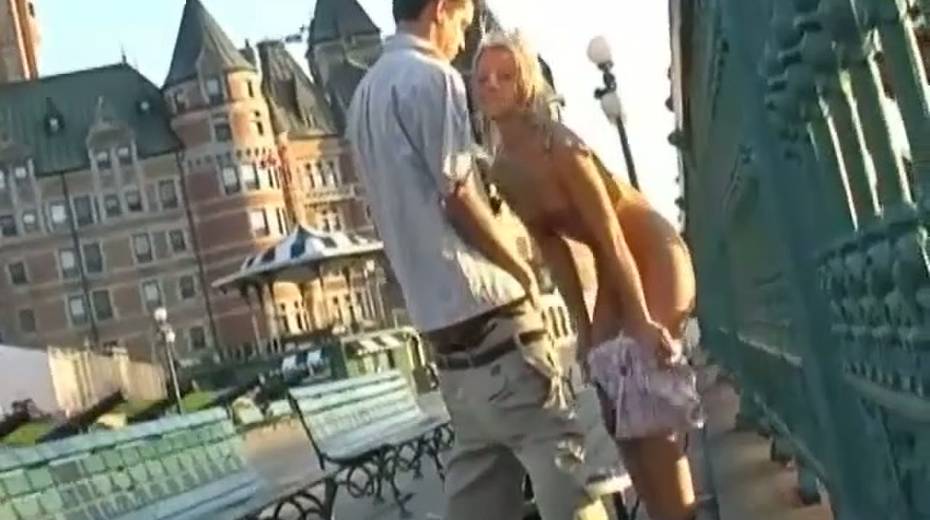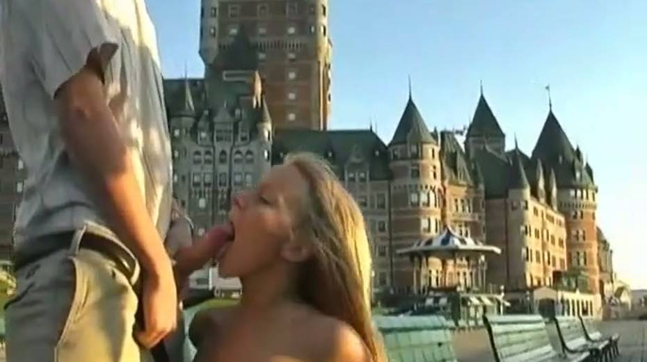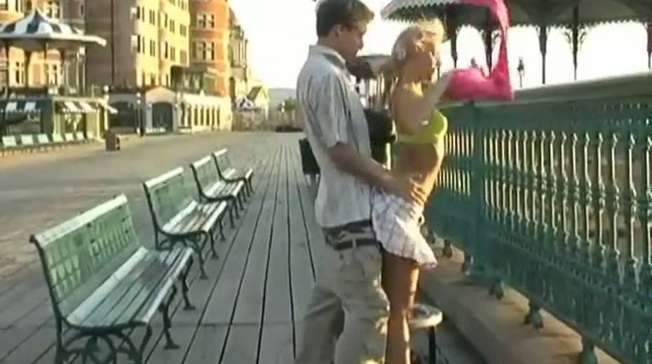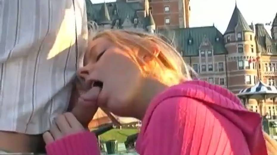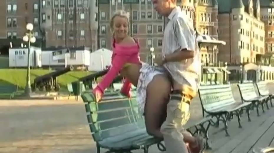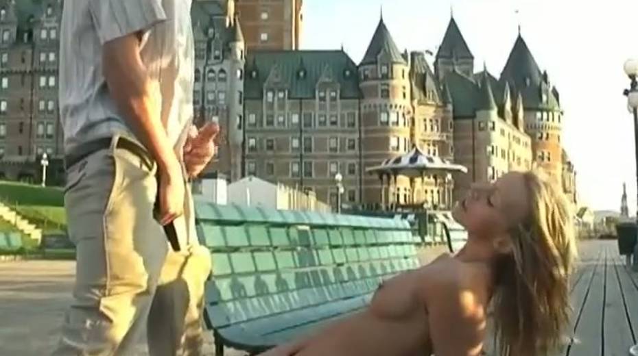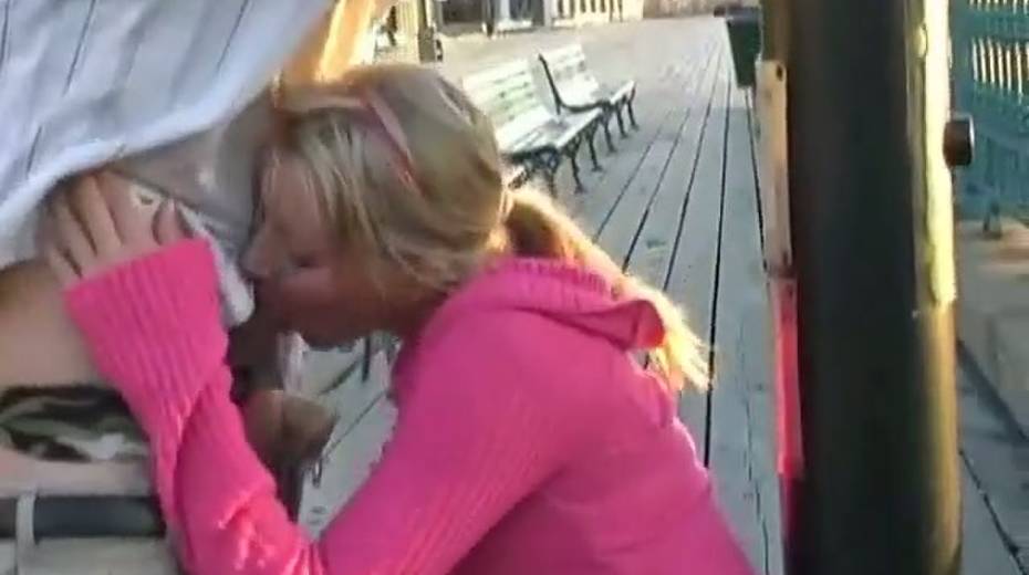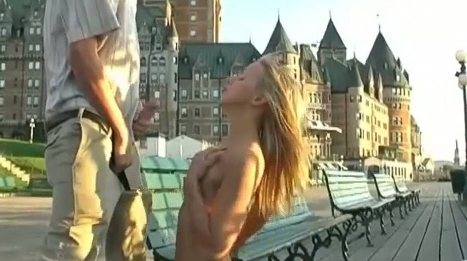 Naughty blond girlfriend Candy Kiss sucks a dick outdoor and gets fucked on the bench
