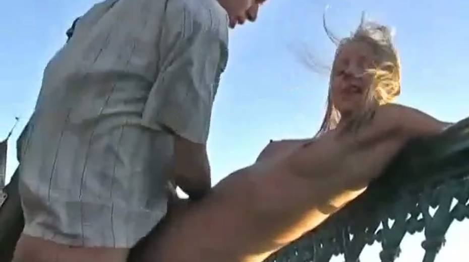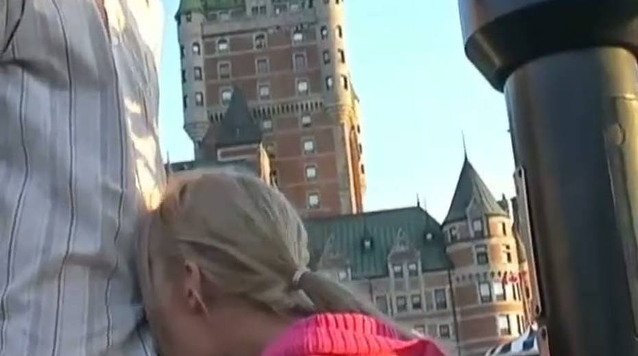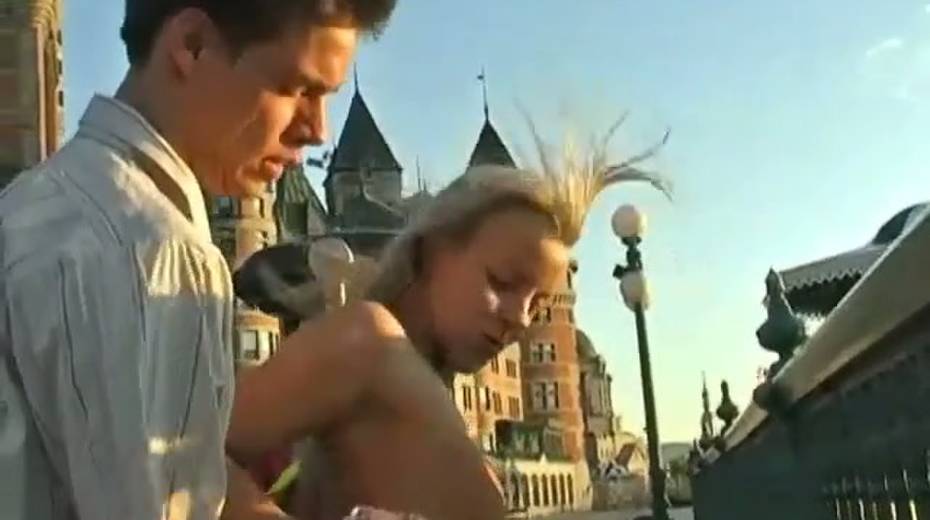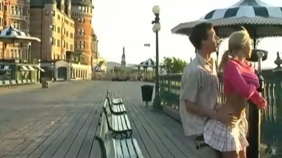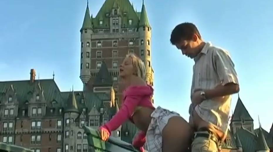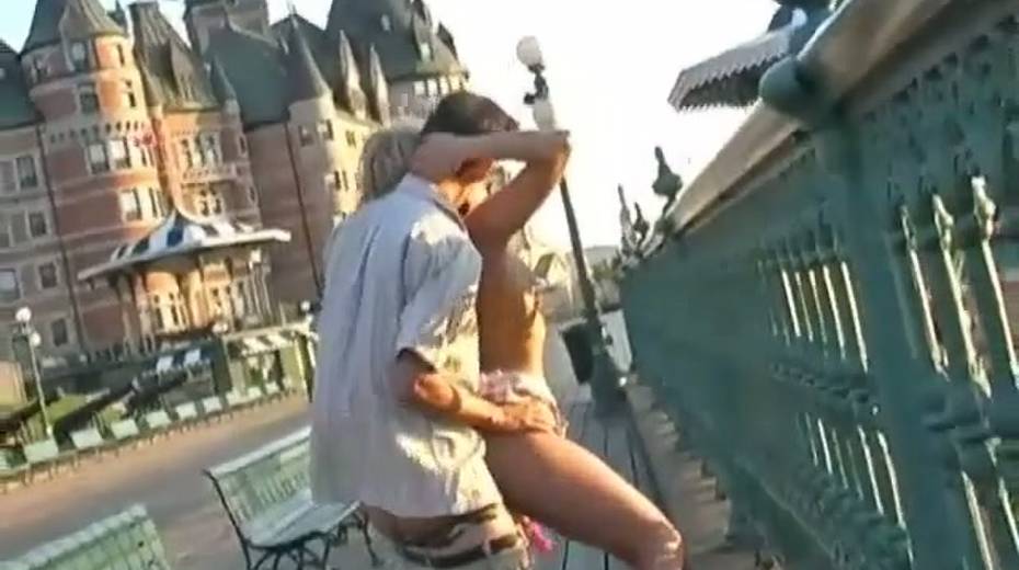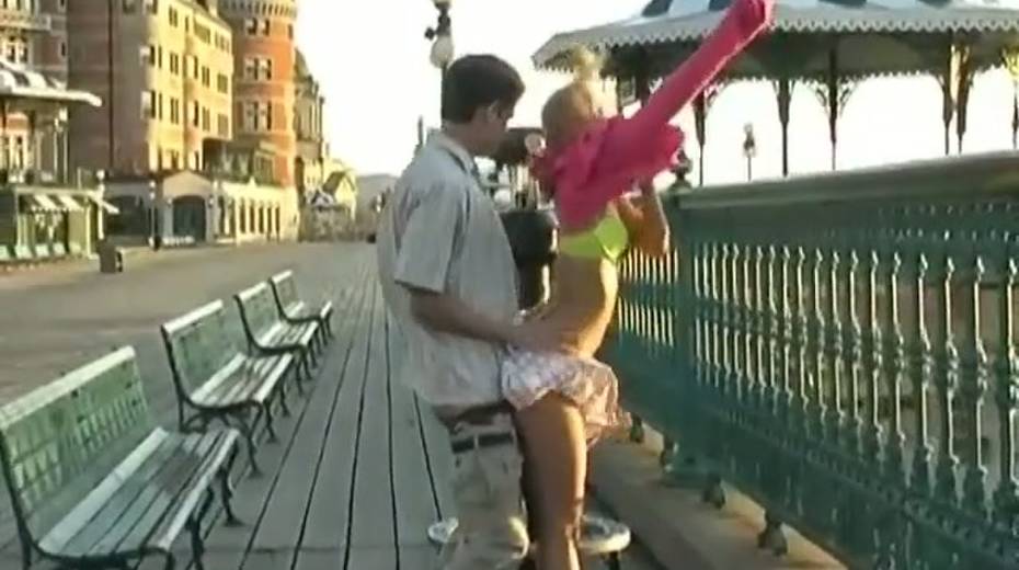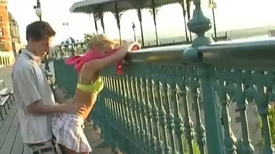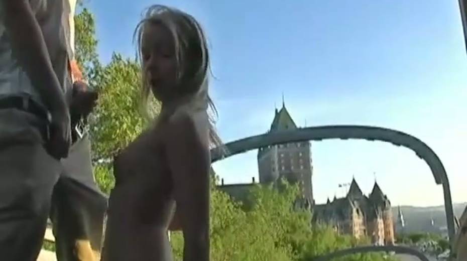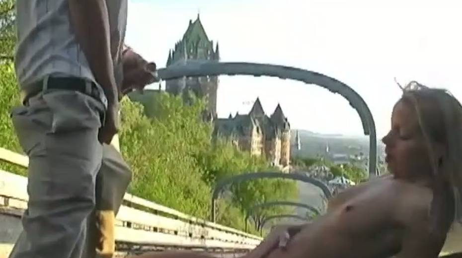 Naughty blond girlfriend Candy Kiss sucks a dick outdoor and gets fucked on the bench