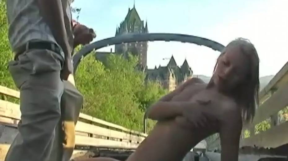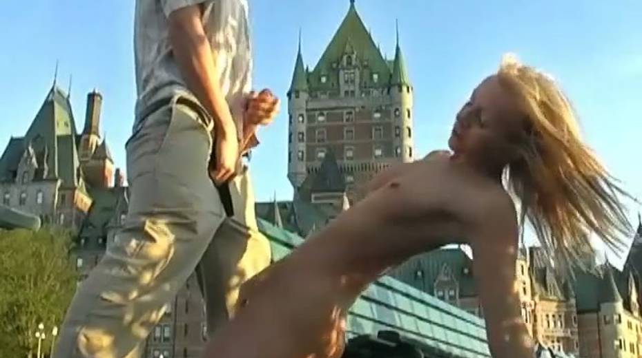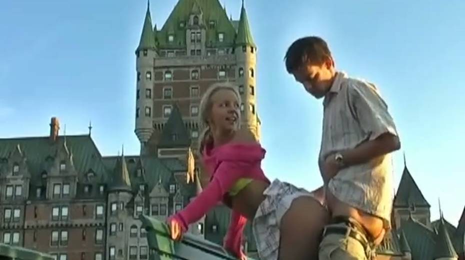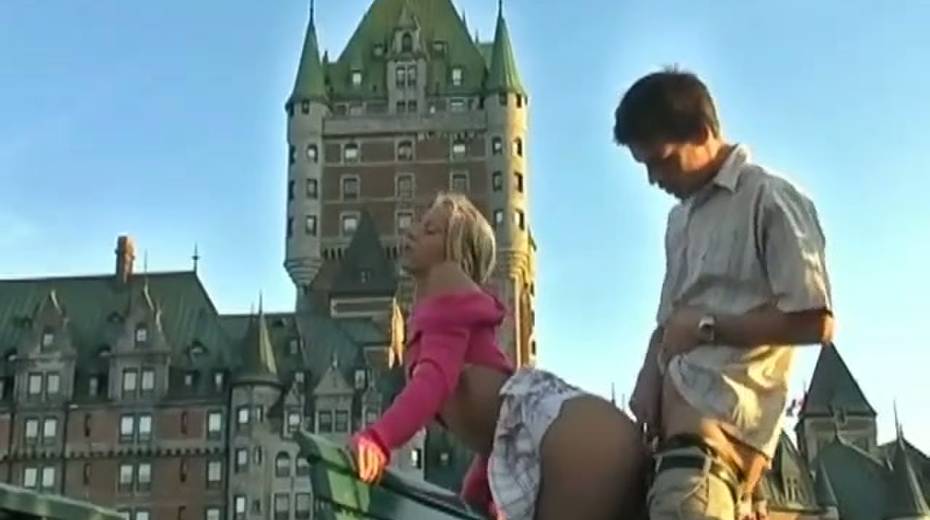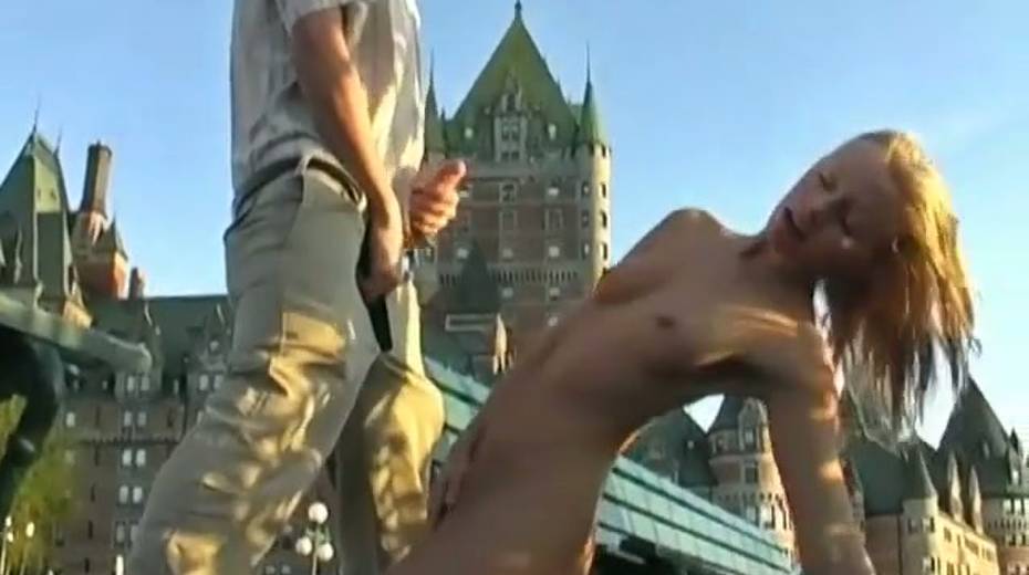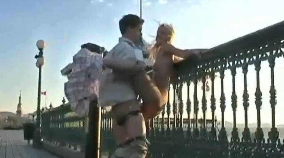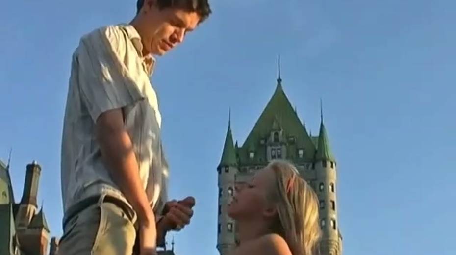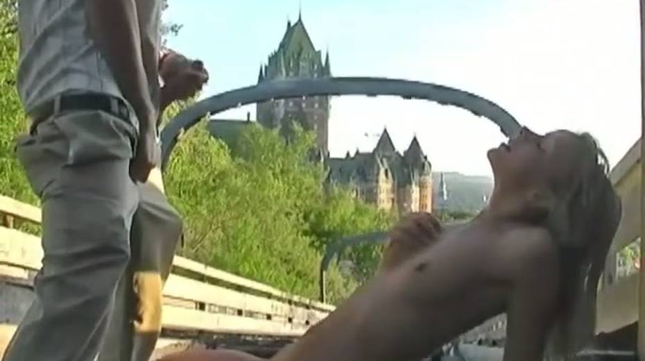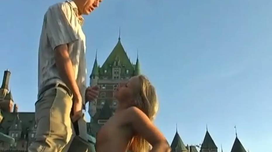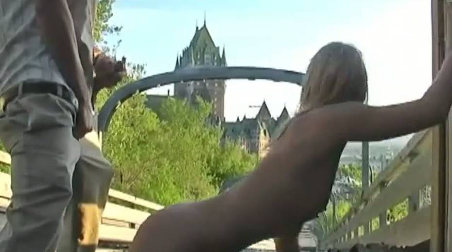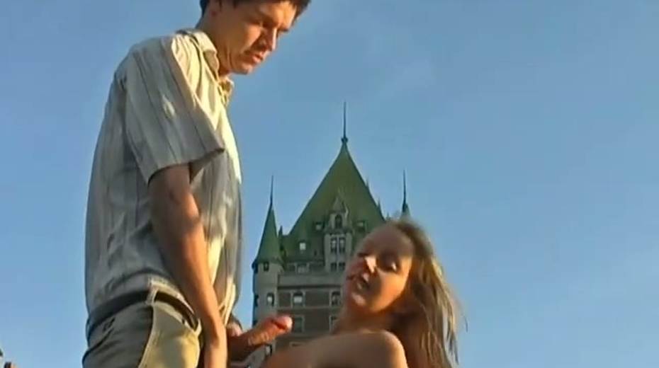 Naughty blond girlfriend Candy Kiss sucks a dick outdoor and gets fucked on the bench