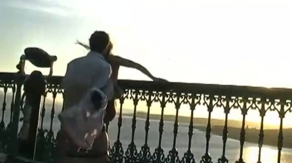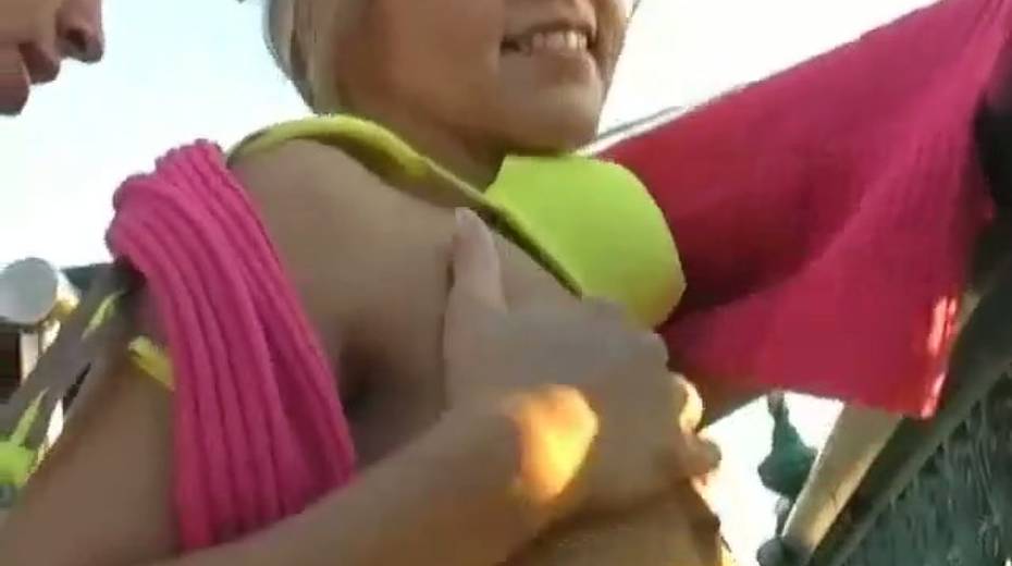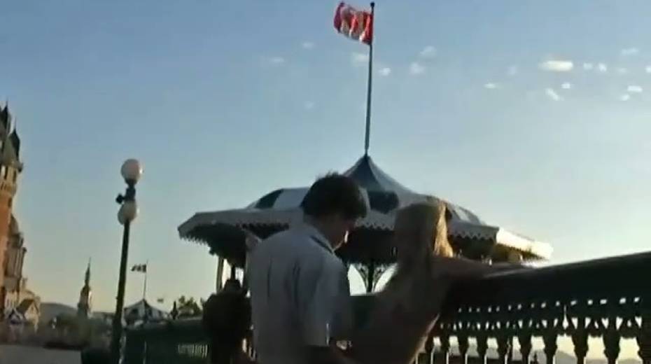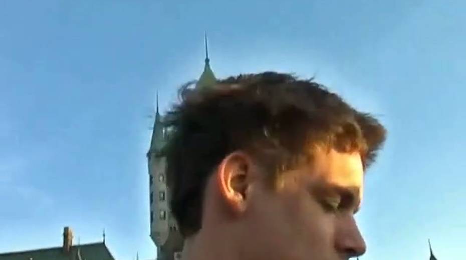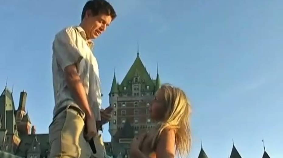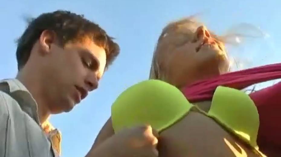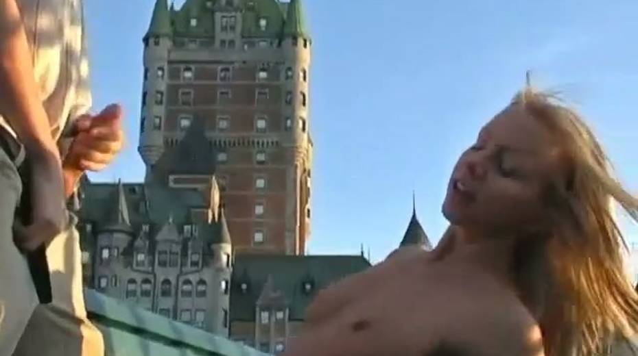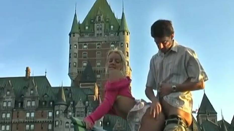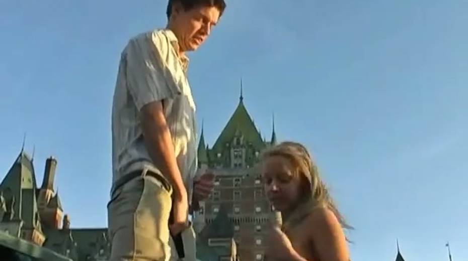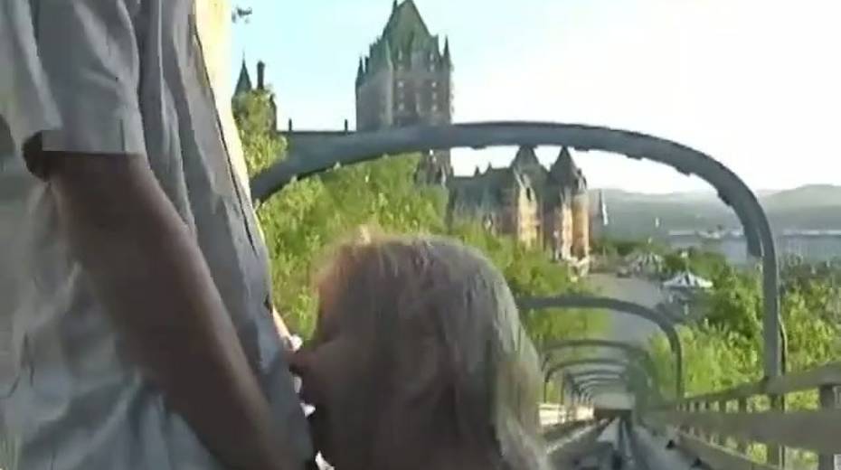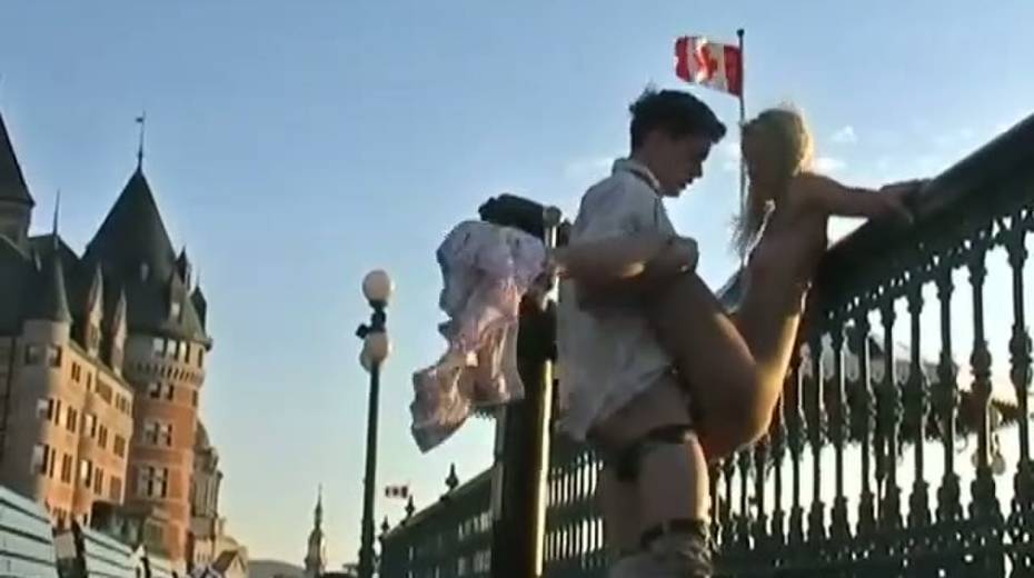 Naughty blond girlfriend Candy Kiss sucks a dick outdoor and gets fucked on the bench