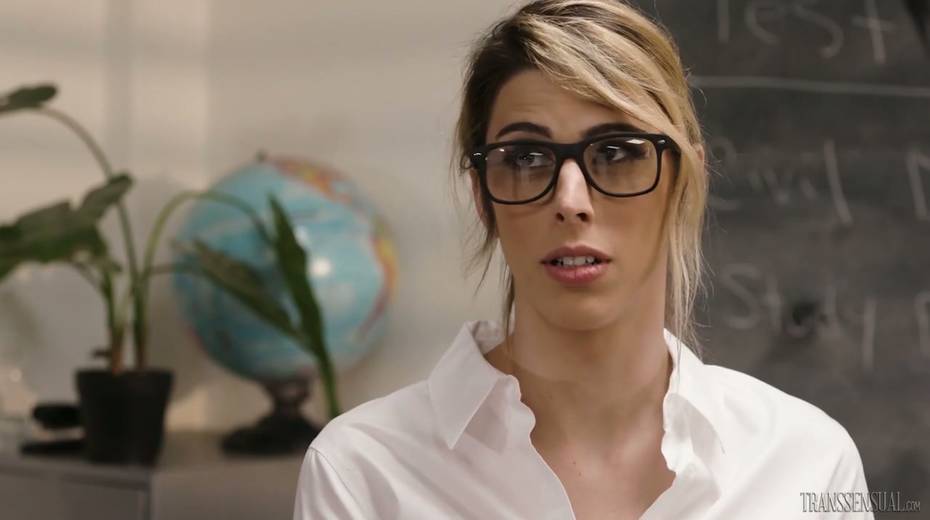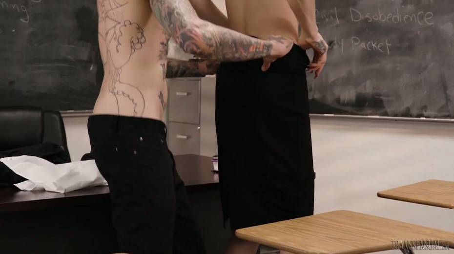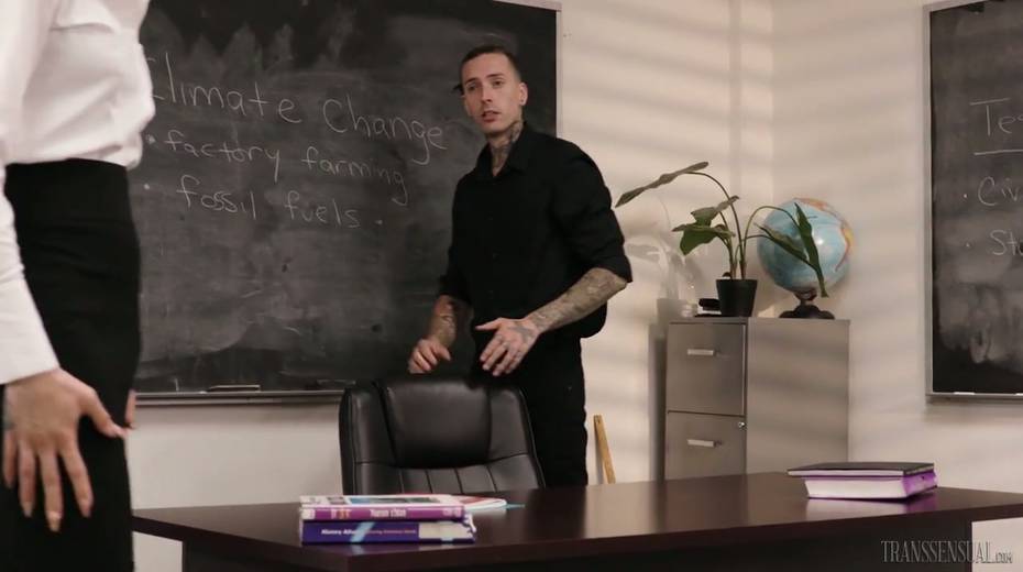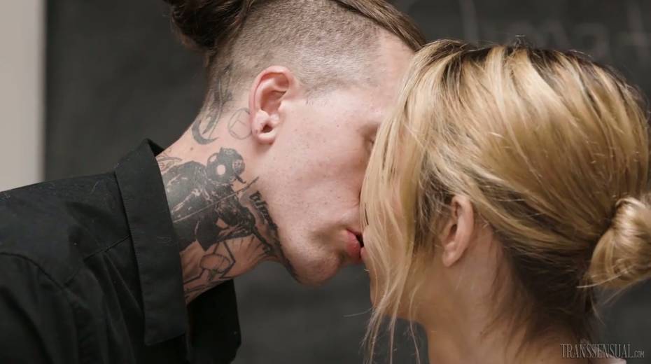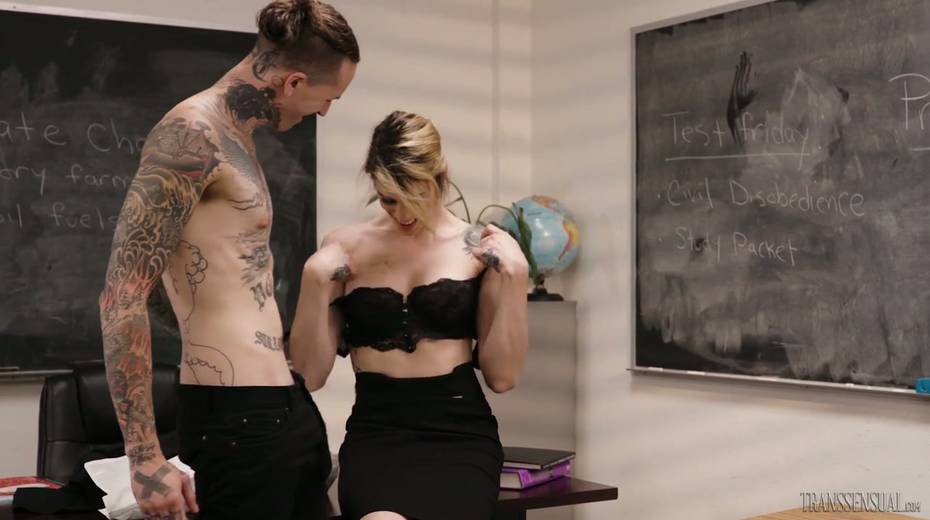Tall shemale teacher Casey Kisses is having an affair with kinky tattooed student
