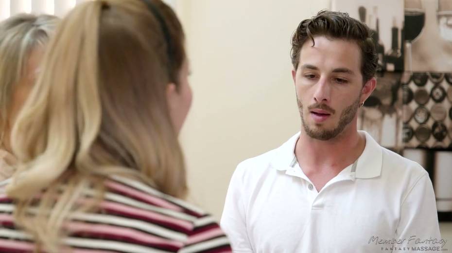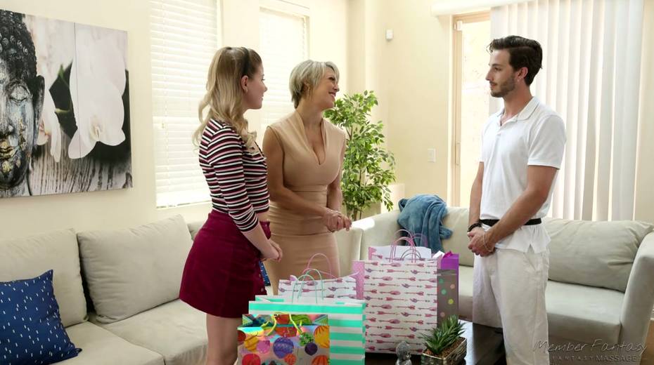 Bosomy milf Dee Williams and her girlfriend fuck one young masseur