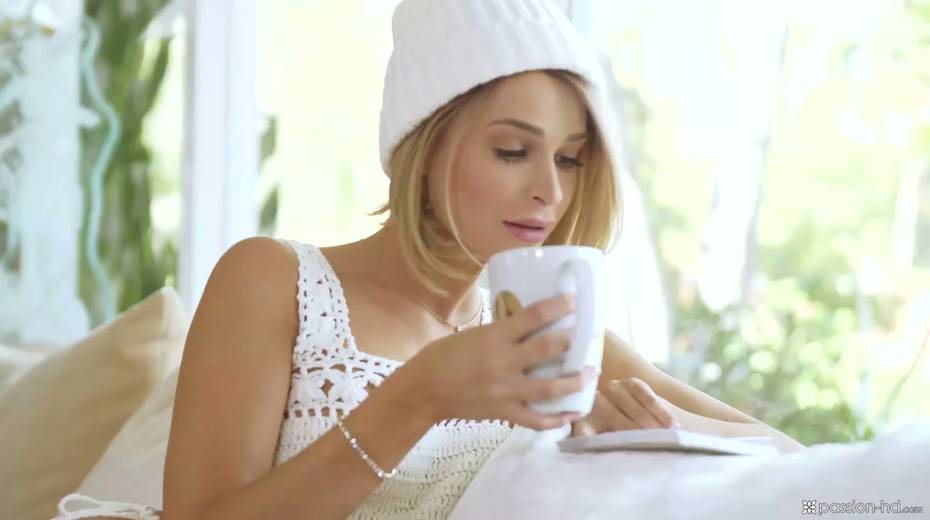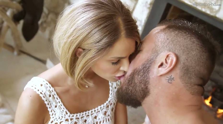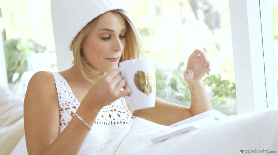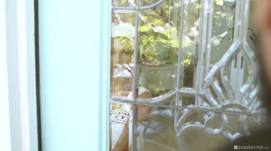 Tanned brunette in white Emma Hix gives a sensual blowjob and gets her slit banged