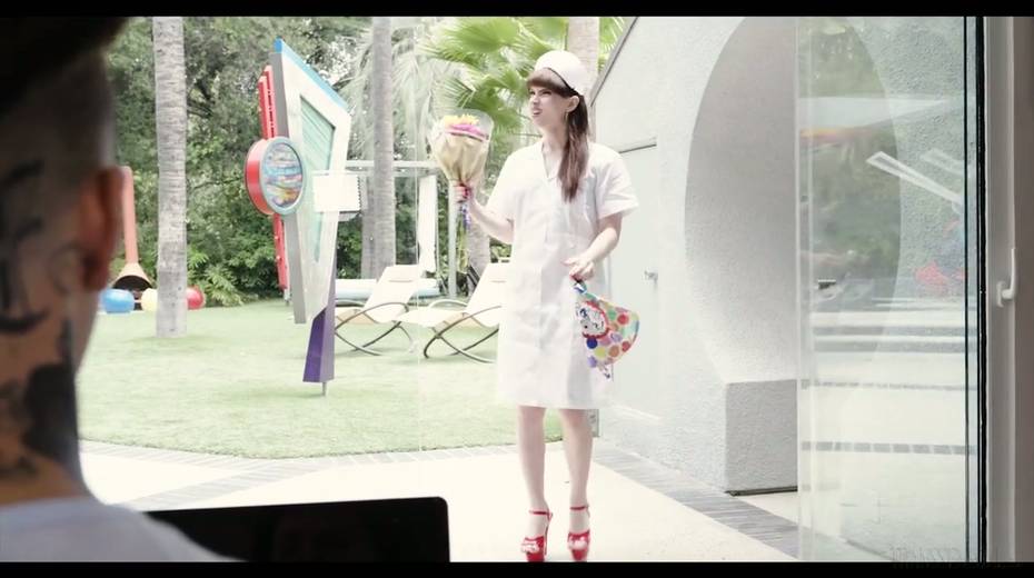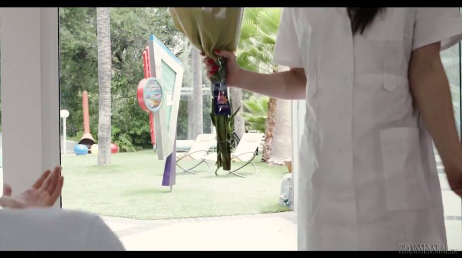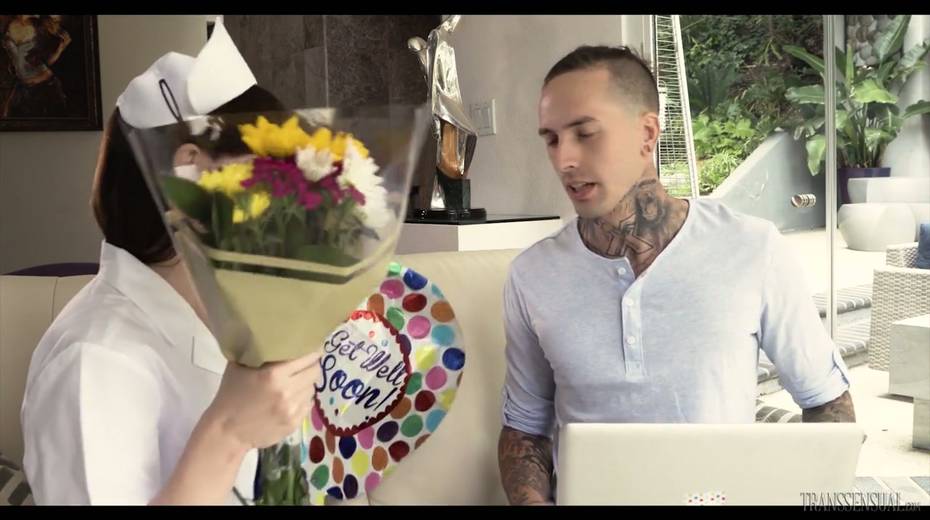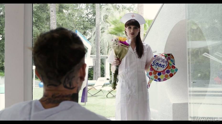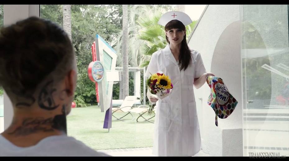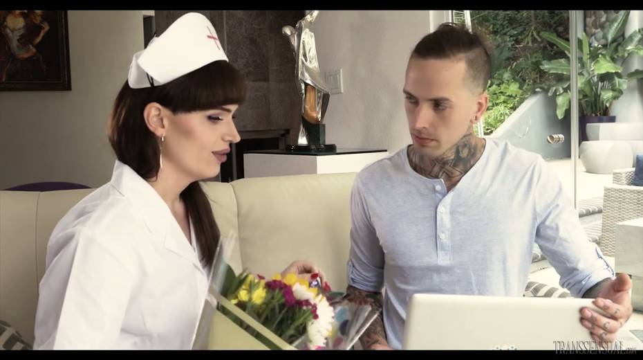 Tranny in nurse uniform Natalie Mars gives a blowjob before a steamy anal pounding