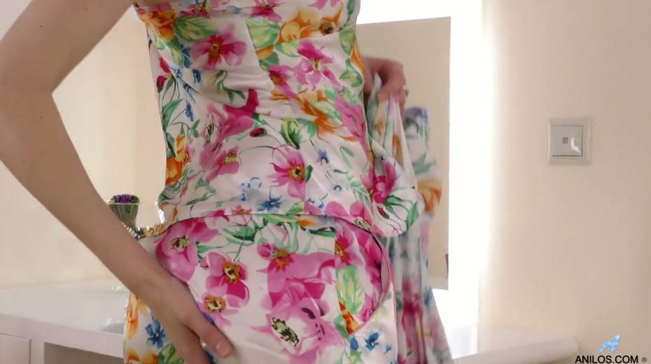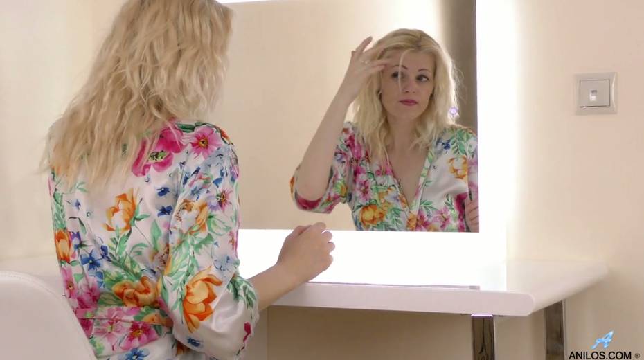 Blond housewife Sasha Jess is playing with her new sex toy spreading legs wide open