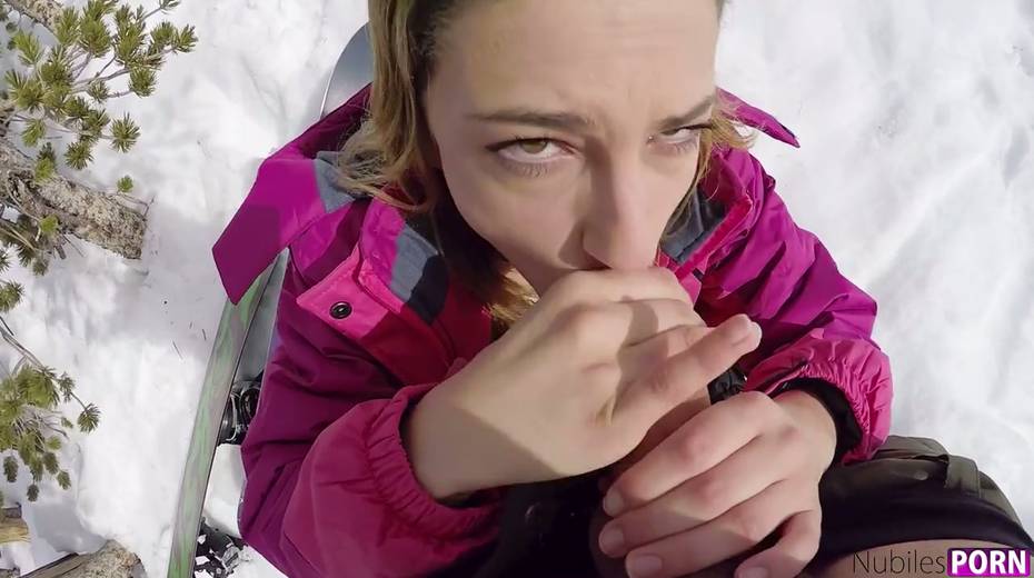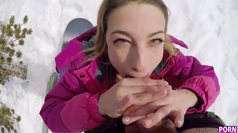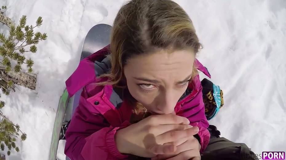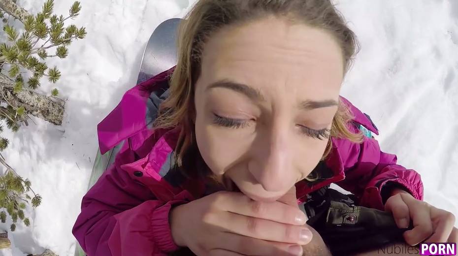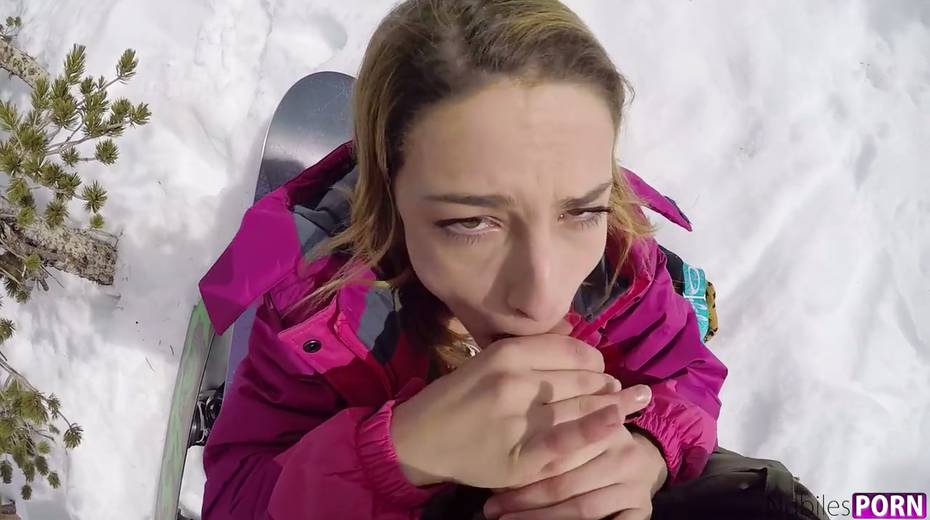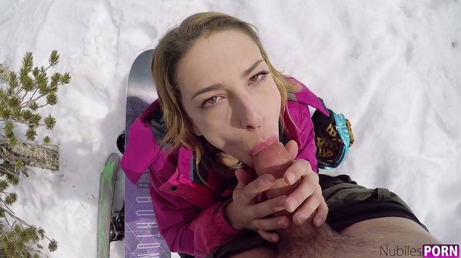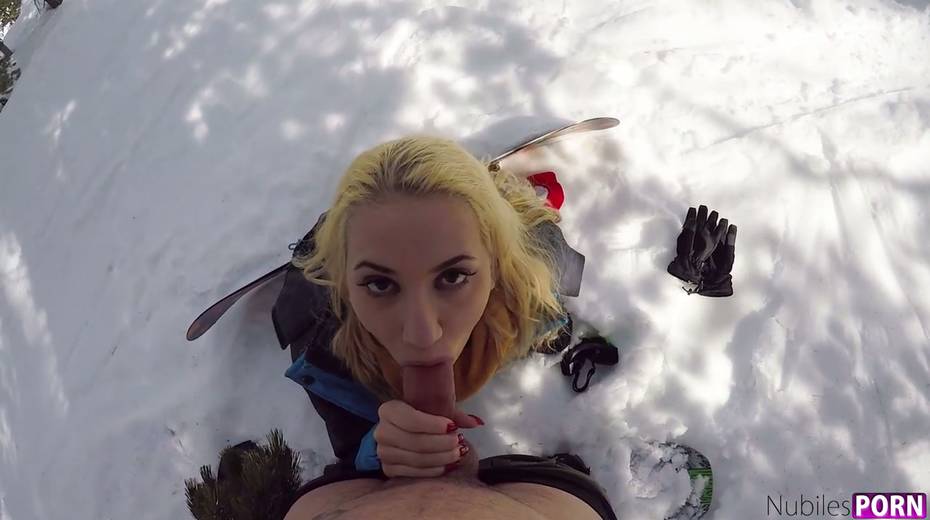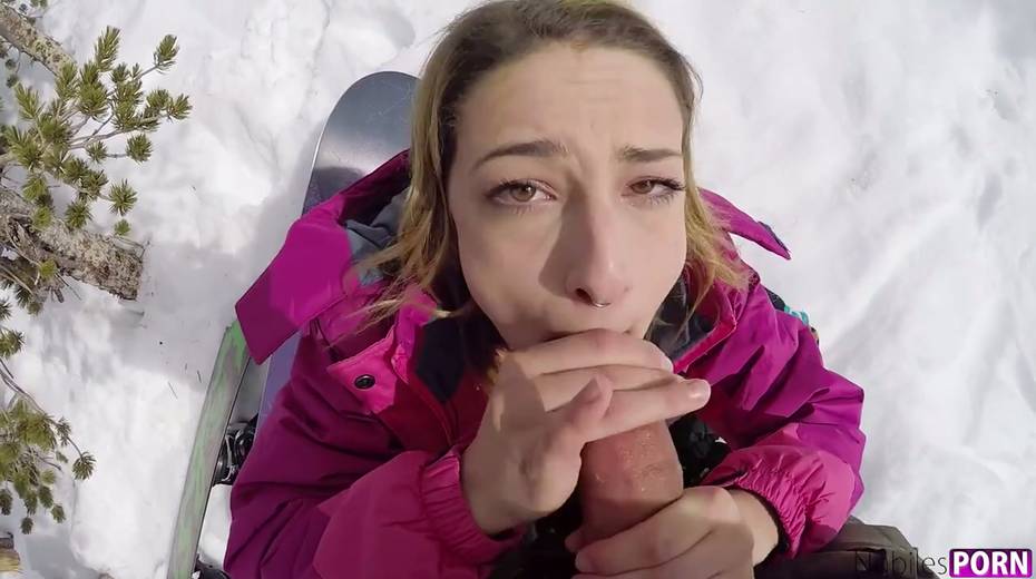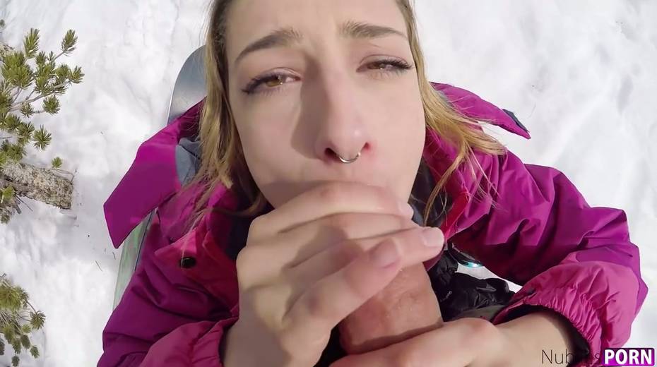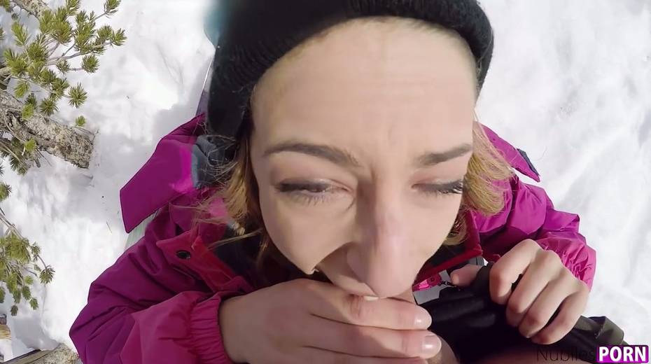 Slutty chick Kristen Scott gives a great blowjob in the snowy mountains