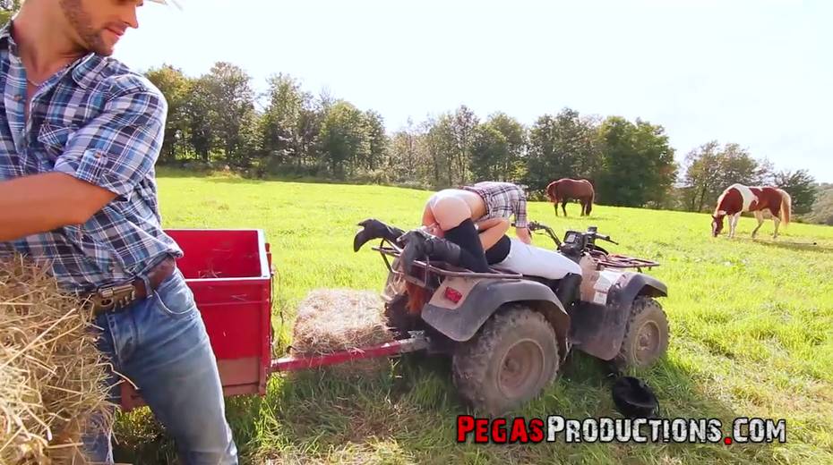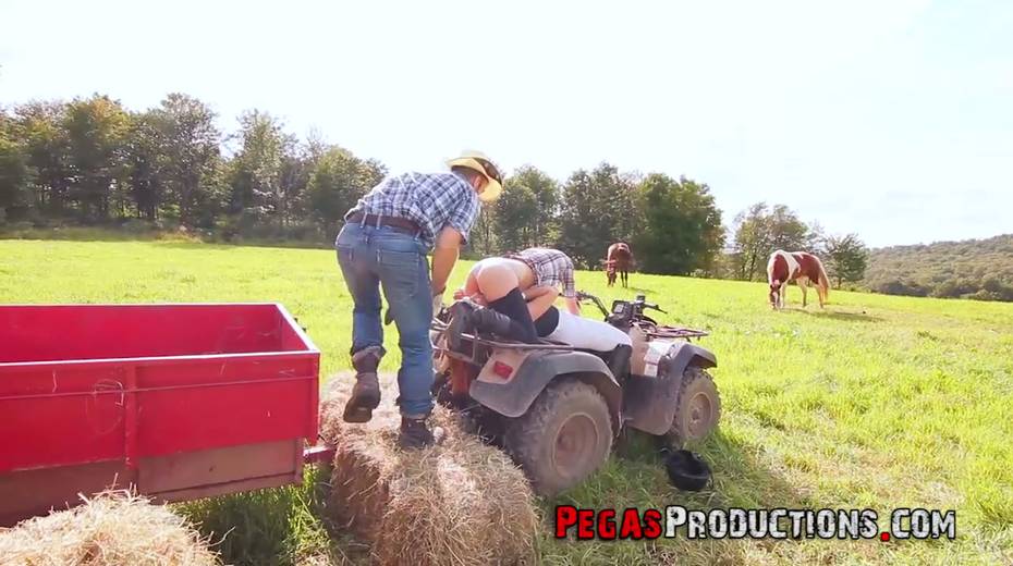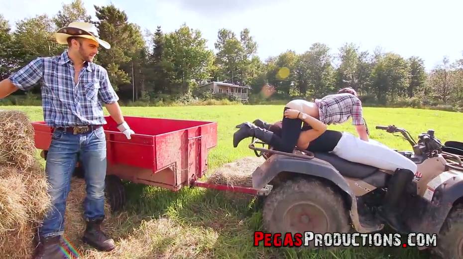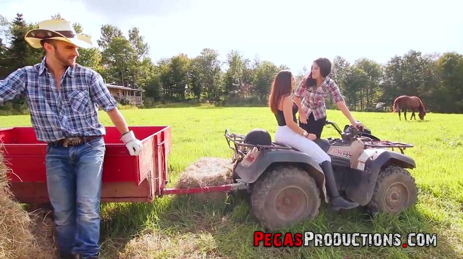 One lucky dude fucks two seductive country chicks right in the field