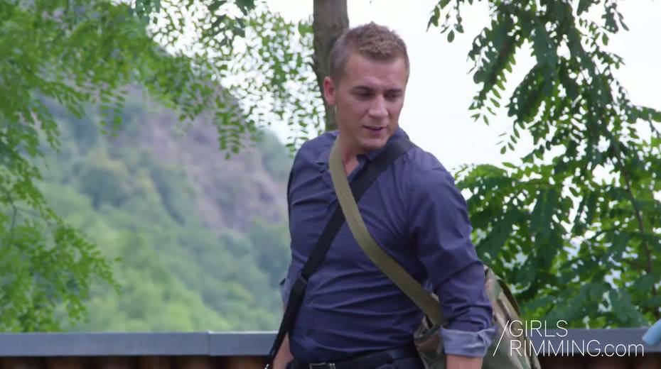 Lewd blonde Nathaly Cherie gives a rimjob and blowjob by the poolside
