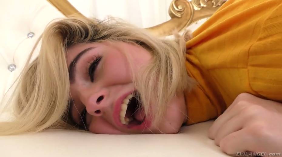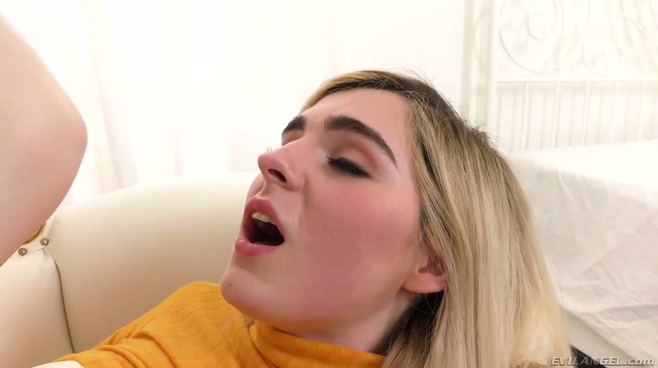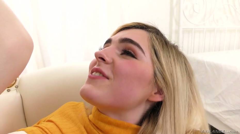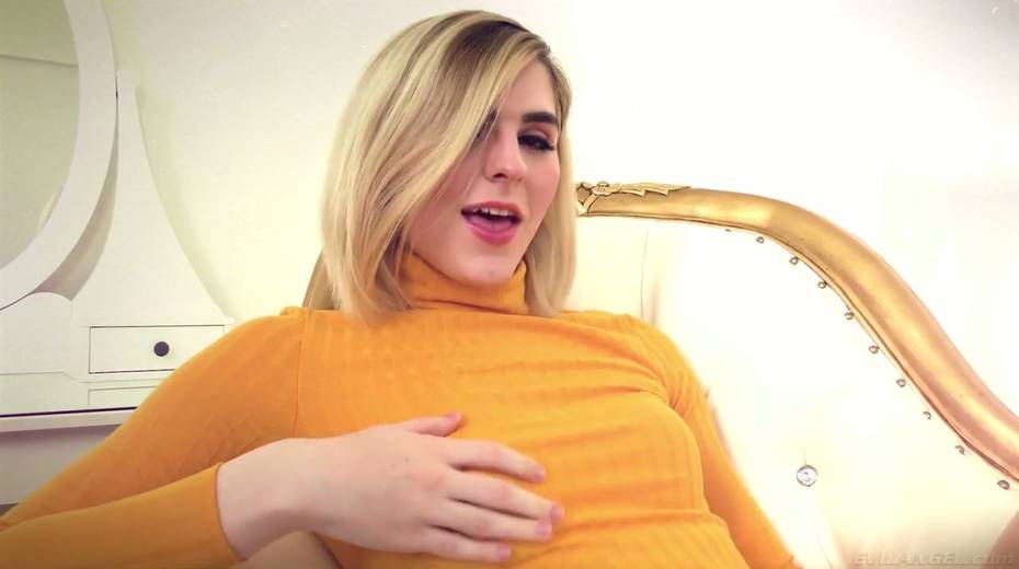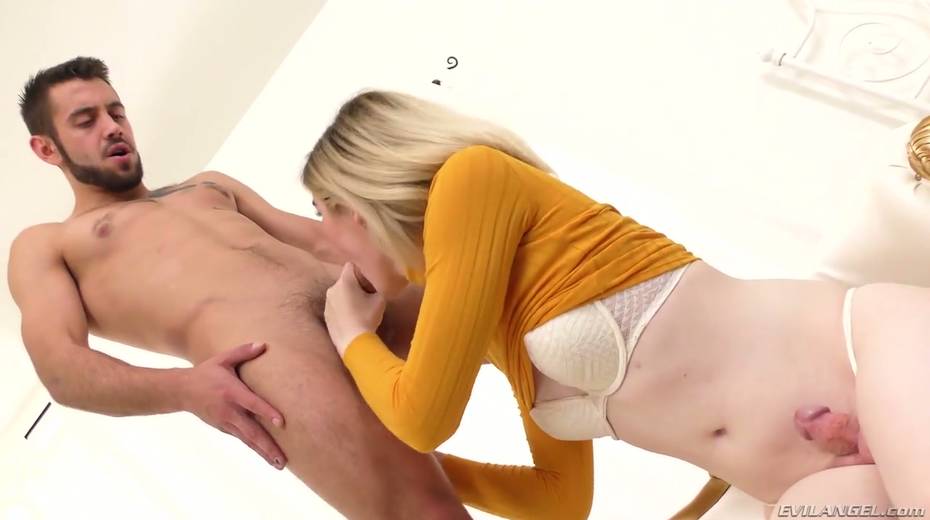 Blond shemale Ella Hollywood is jerking off dick before anal sex doggy style
