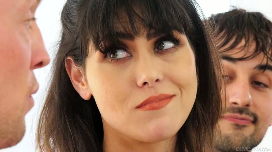 Juggy brunette Audrey Noir and two bisexual dudes enjoy steamy threesome sex