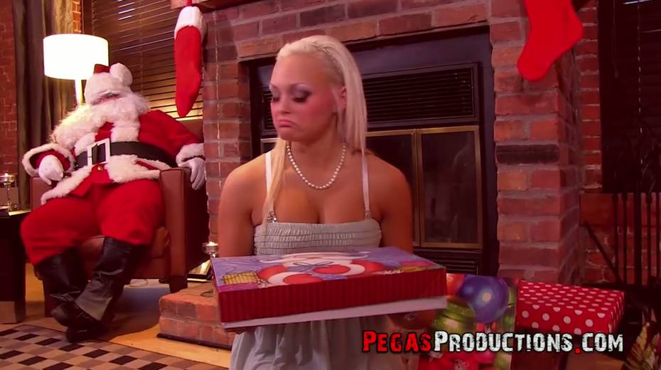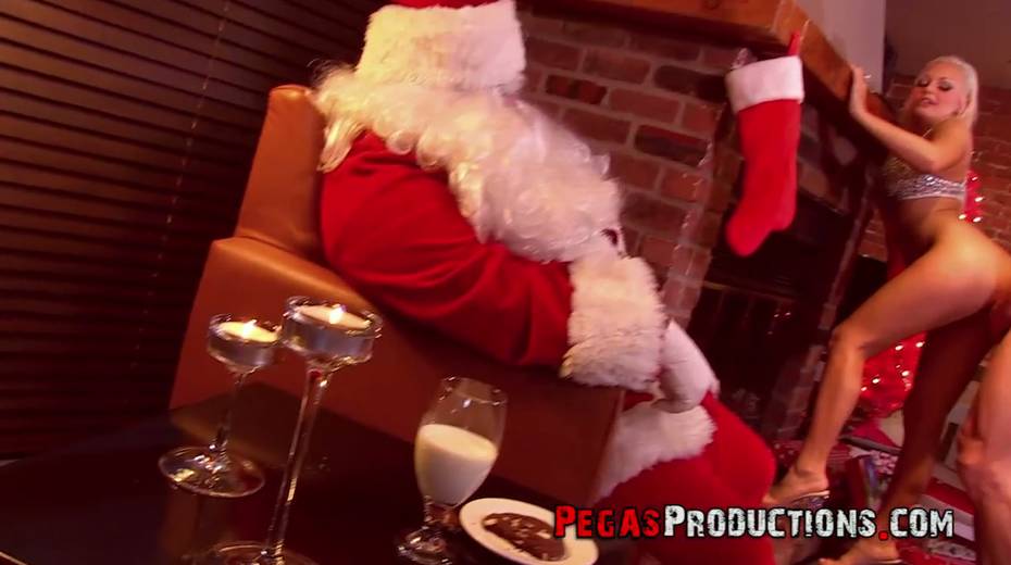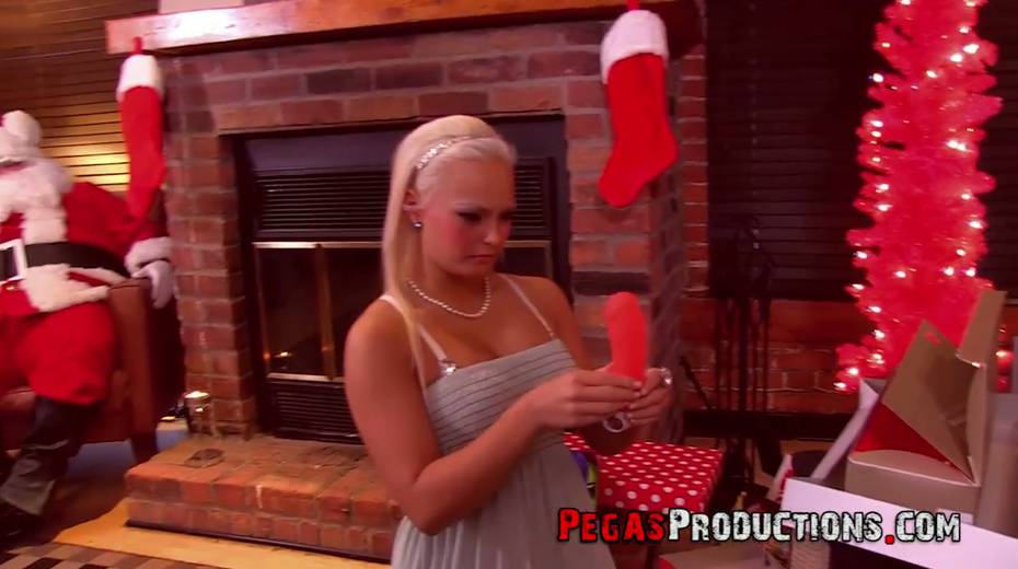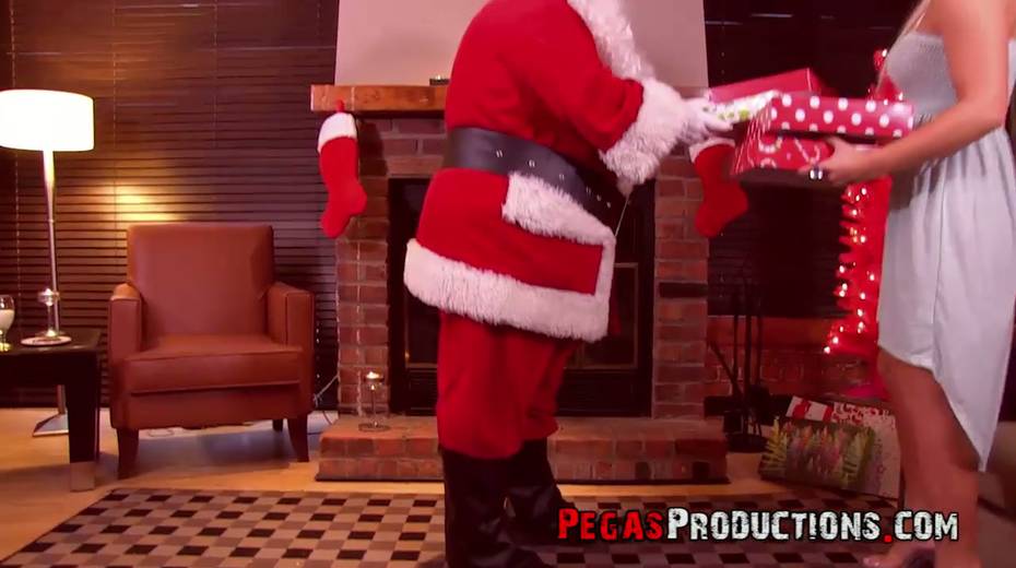 Perverted Santa enjoys watching how Jessie Storm bangs her boyfriend by the fireplace