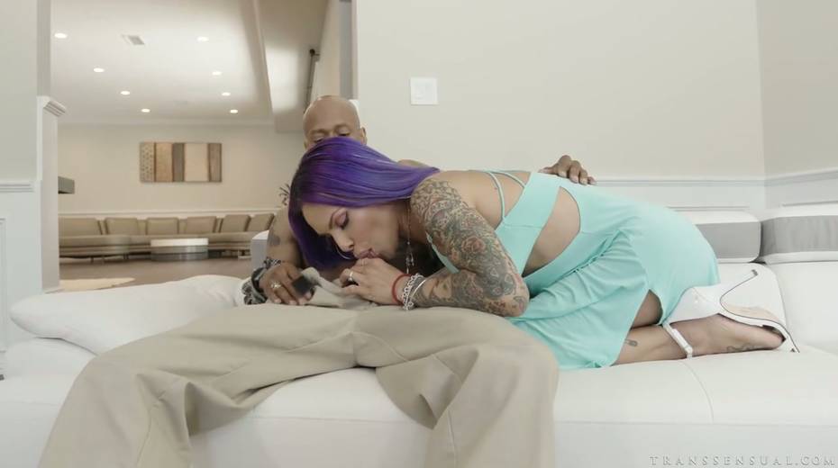 Tattooed T-girl Foxxy is polishing big black dick with lips and anal hole