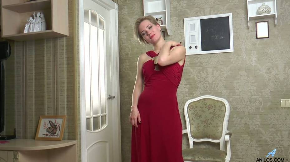 Delicious milf in red dress Lisa Young gets naked and masturbates twat