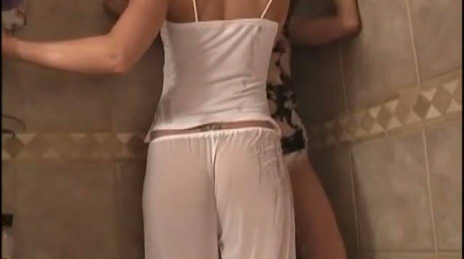 Blonde and brunette are having crazy lesbian clothed sex in the shower