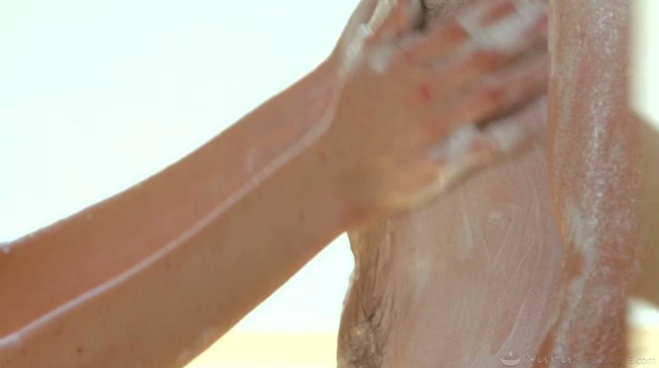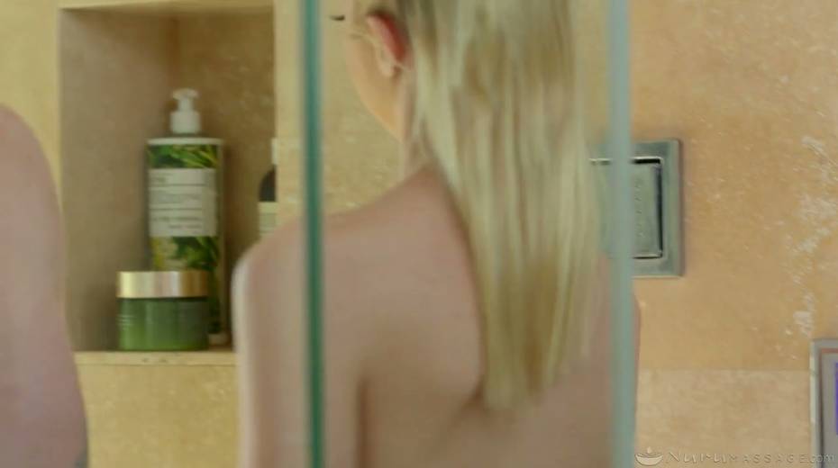 Small tittied Chloe Cherry gives a blowjob in the shower and provides man with a great nuru massage