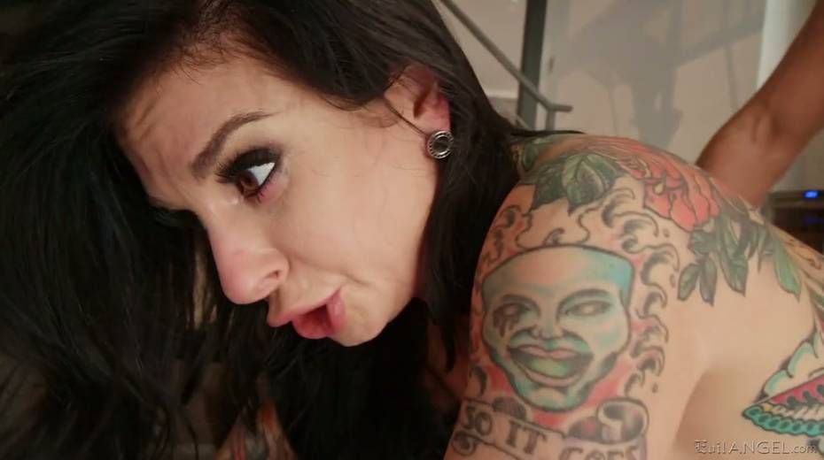Tattooed hooker Joanna Angel takes two huge cocks in stretched anal hole