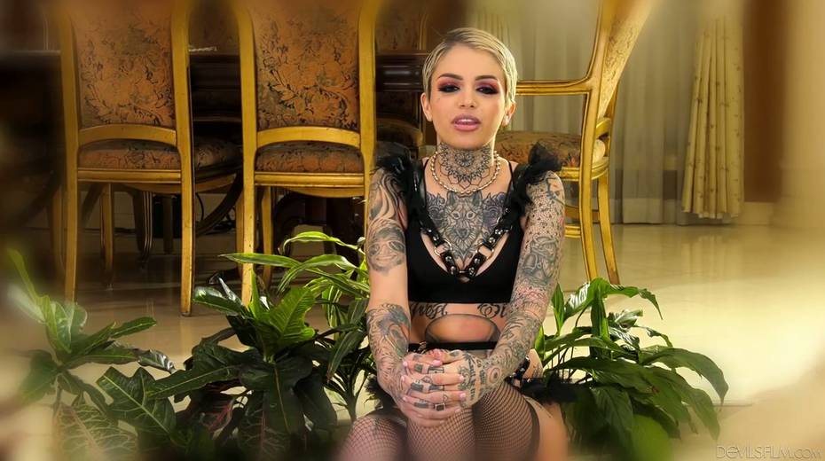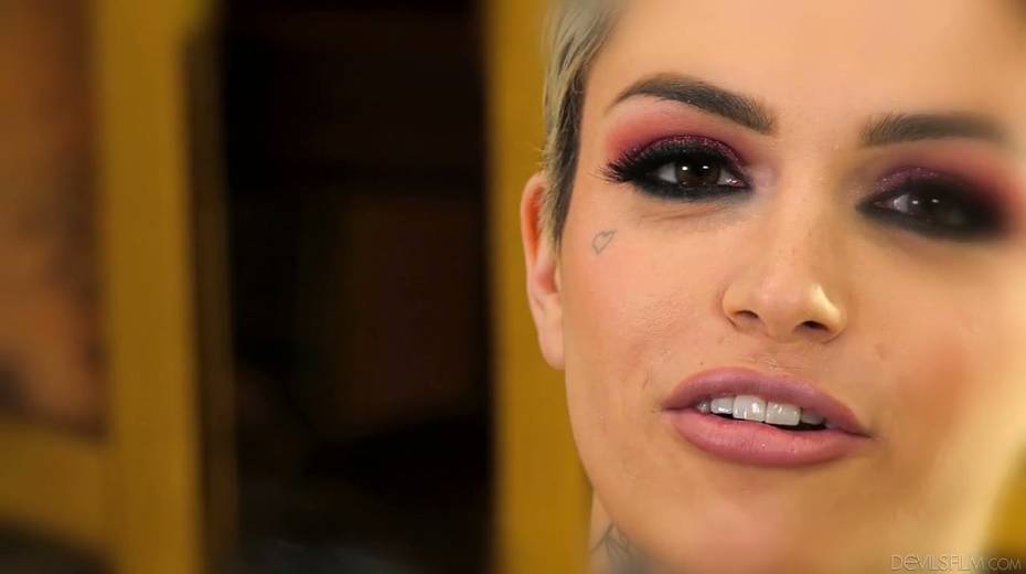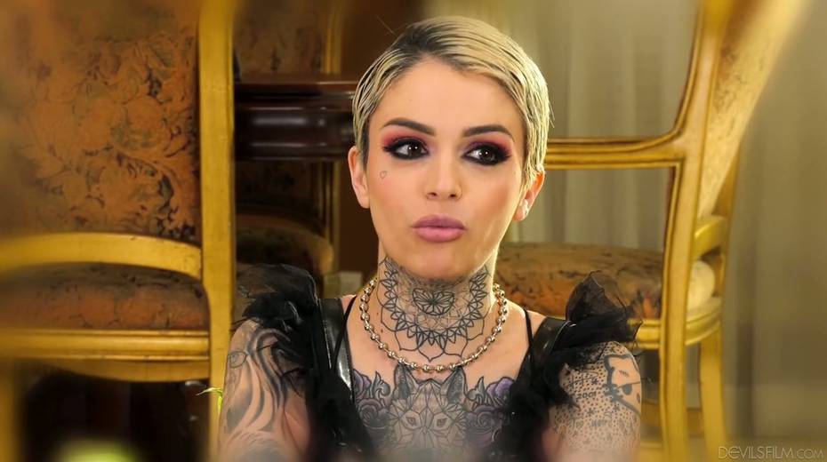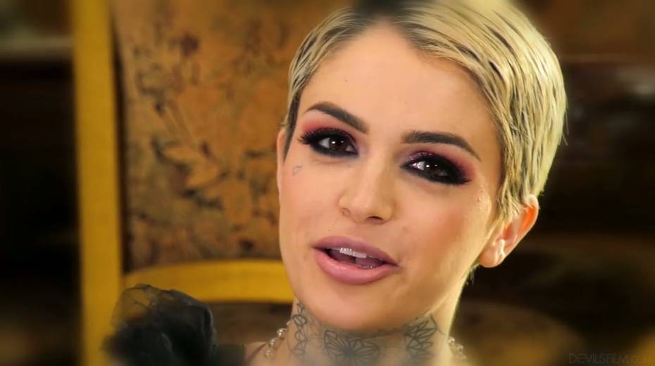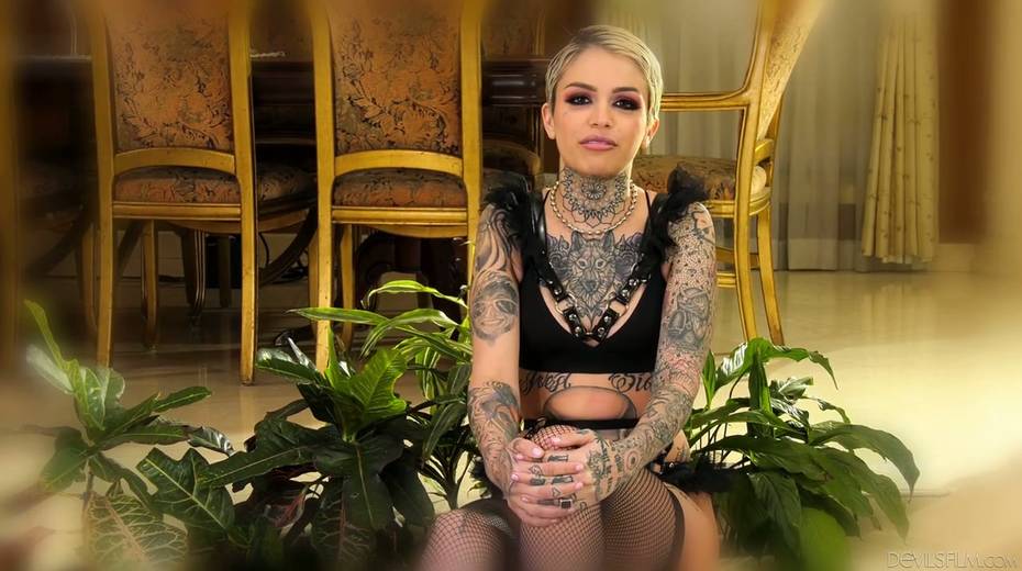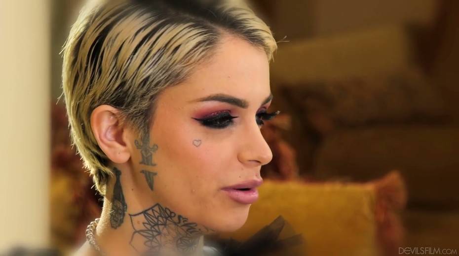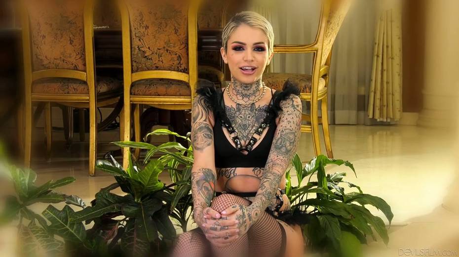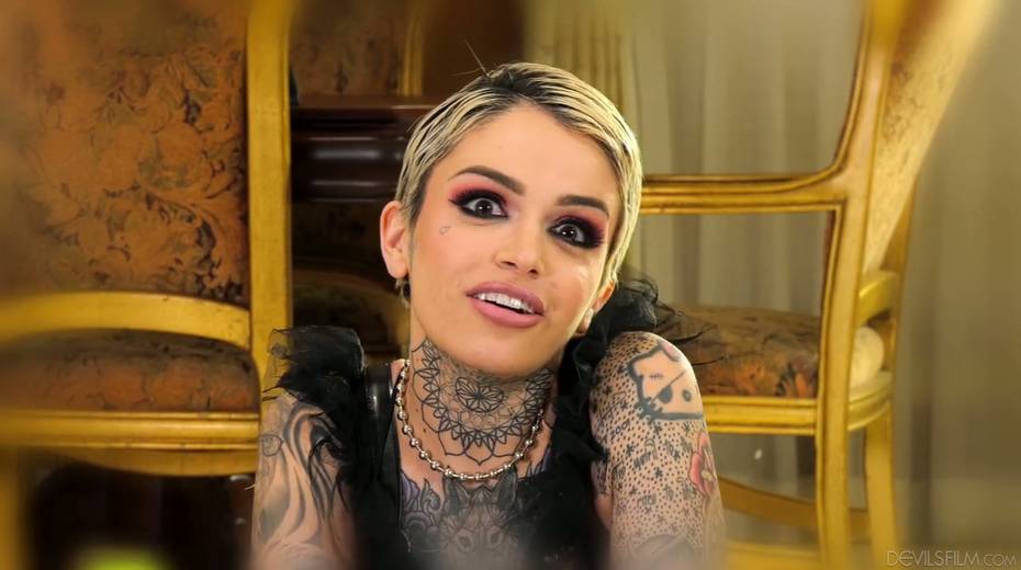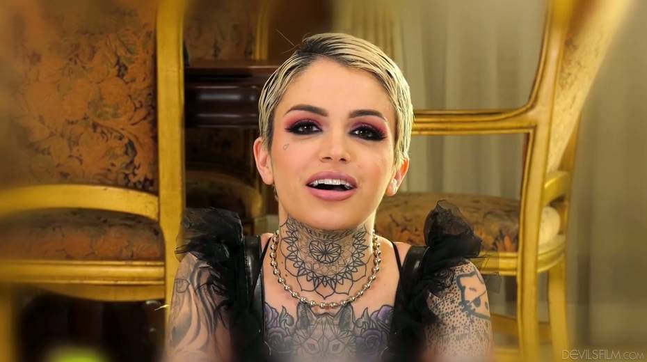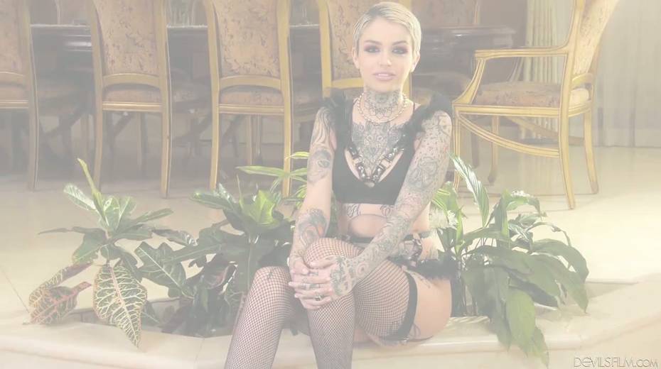 Sexy tattooed hottie Leigh Raven gives interview before shooting