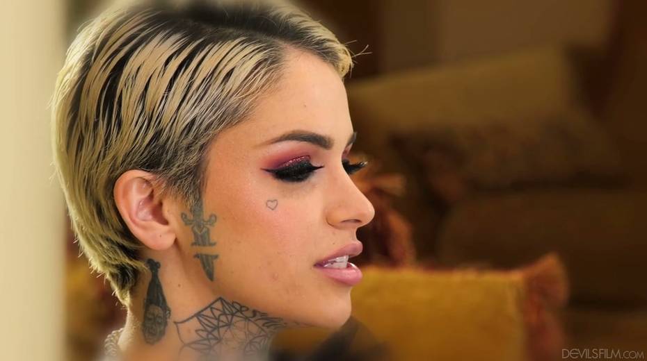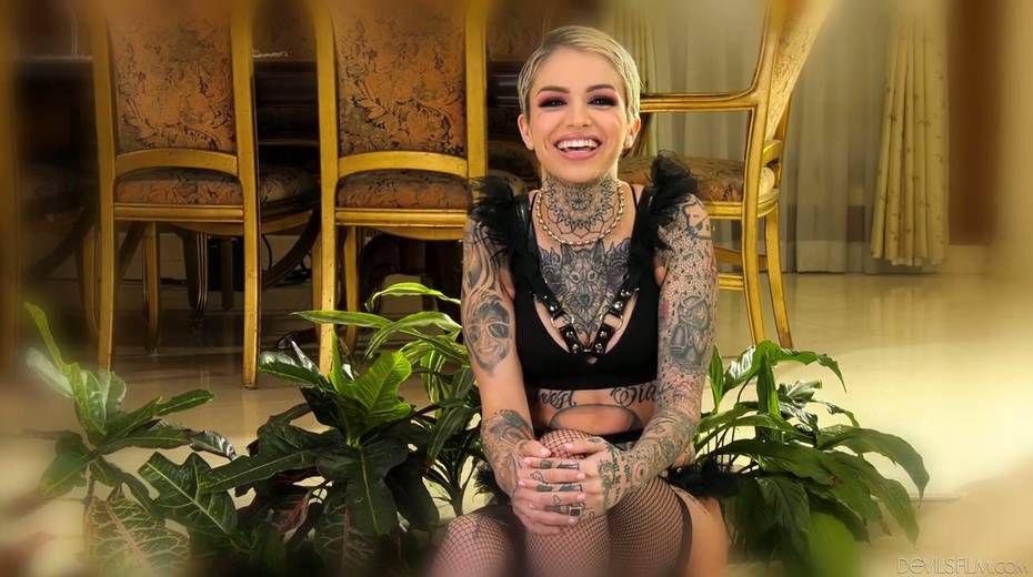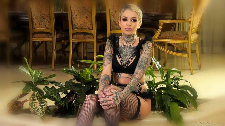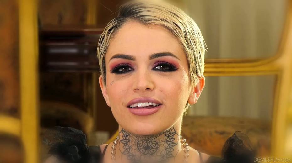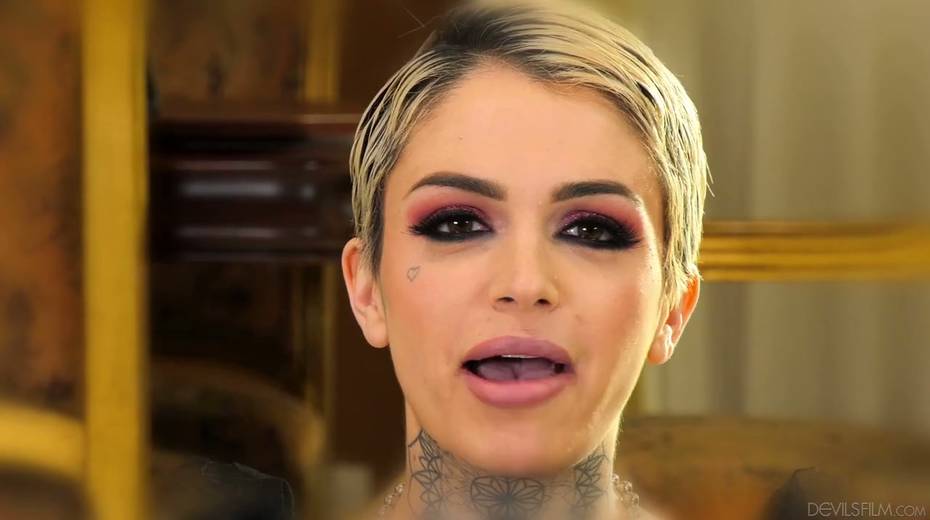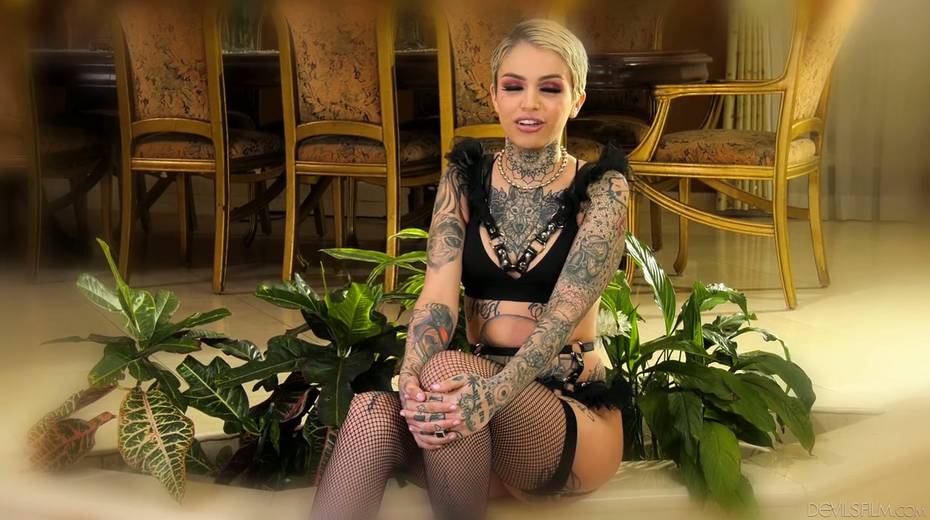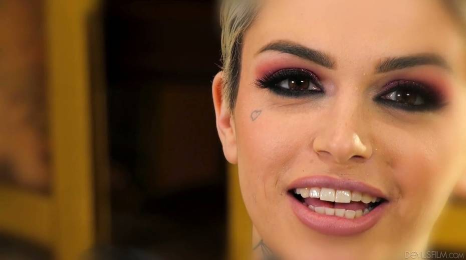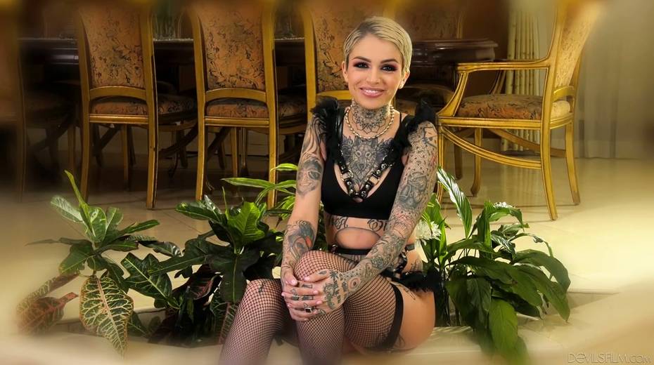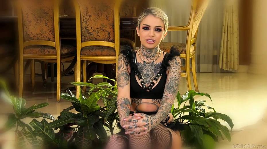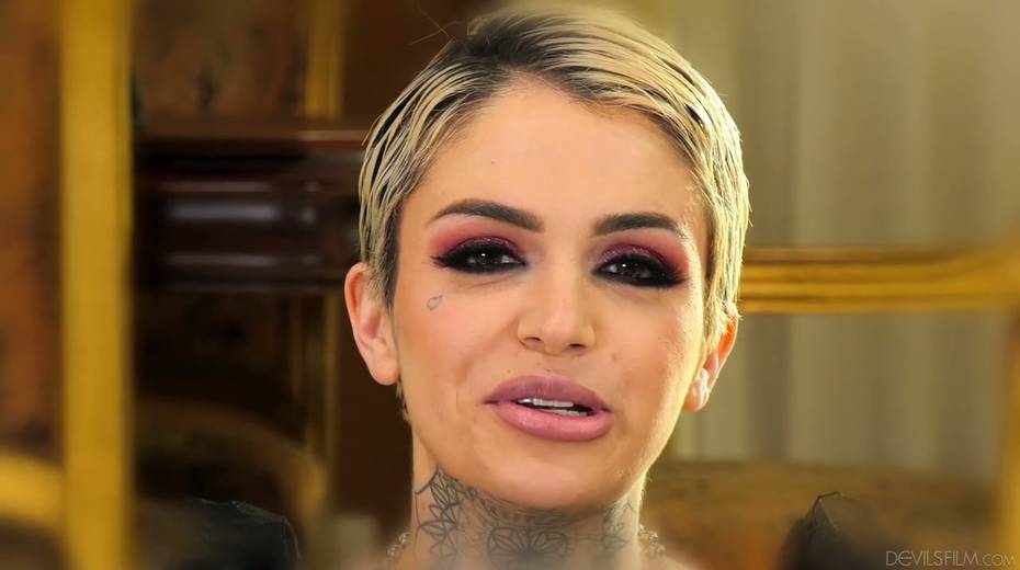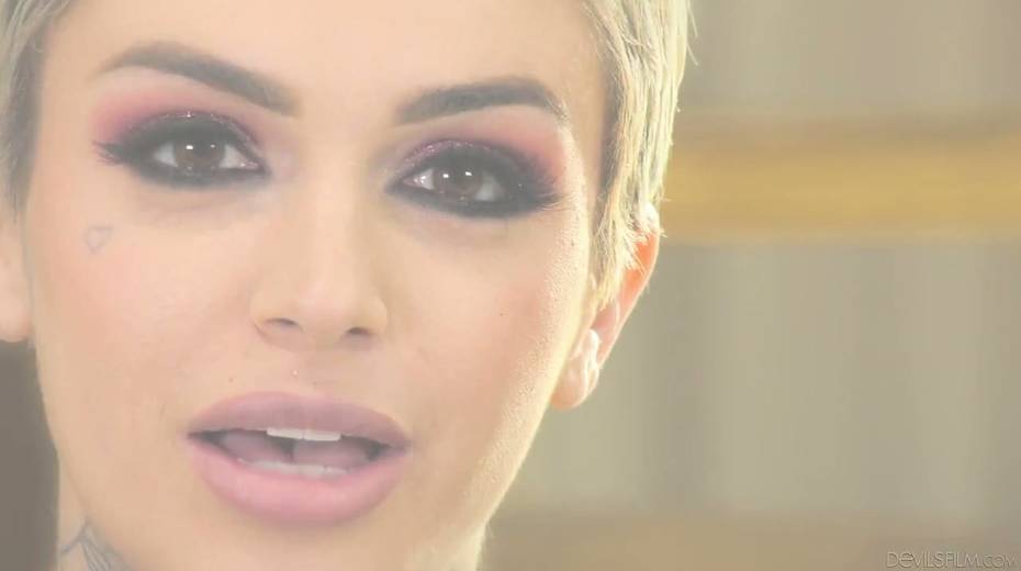 Sexy tattooed hottie Leigh Raven gives interview before shooting