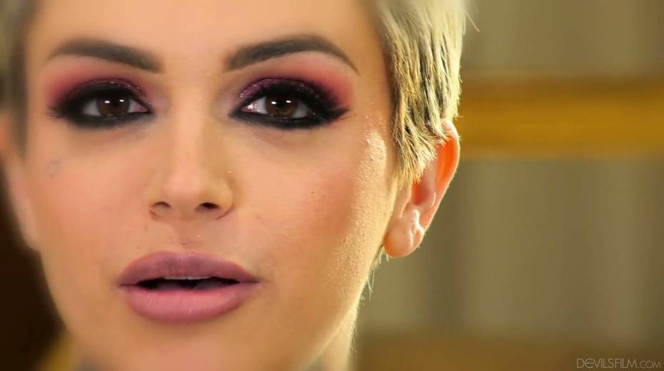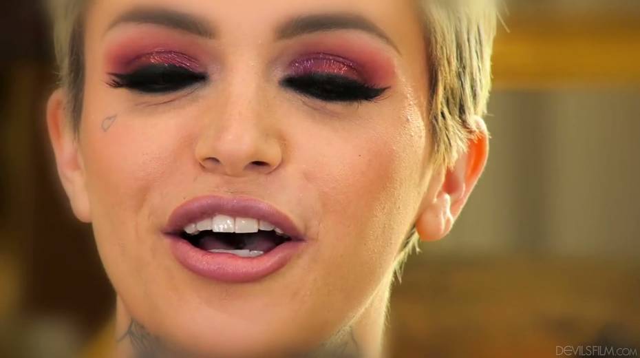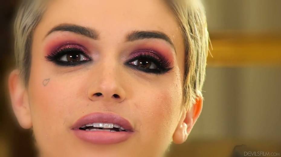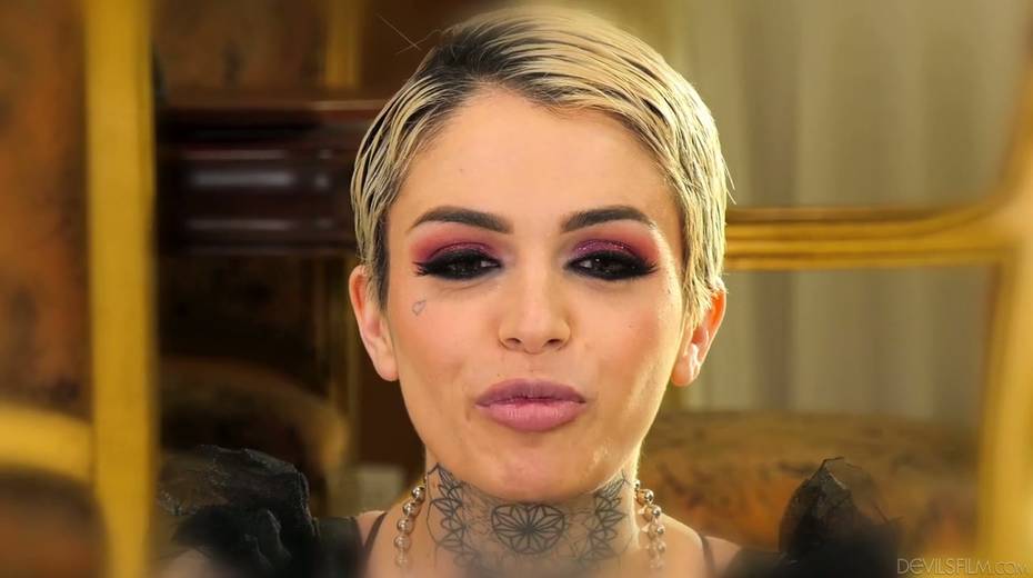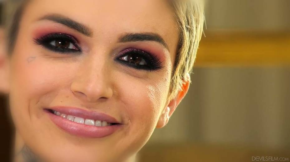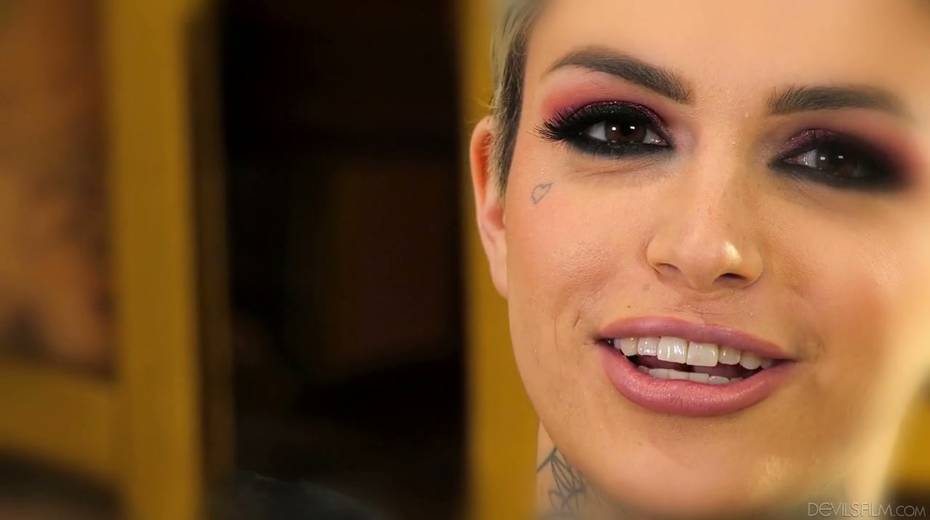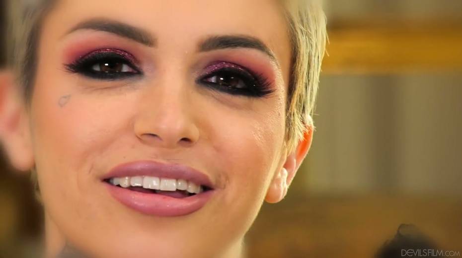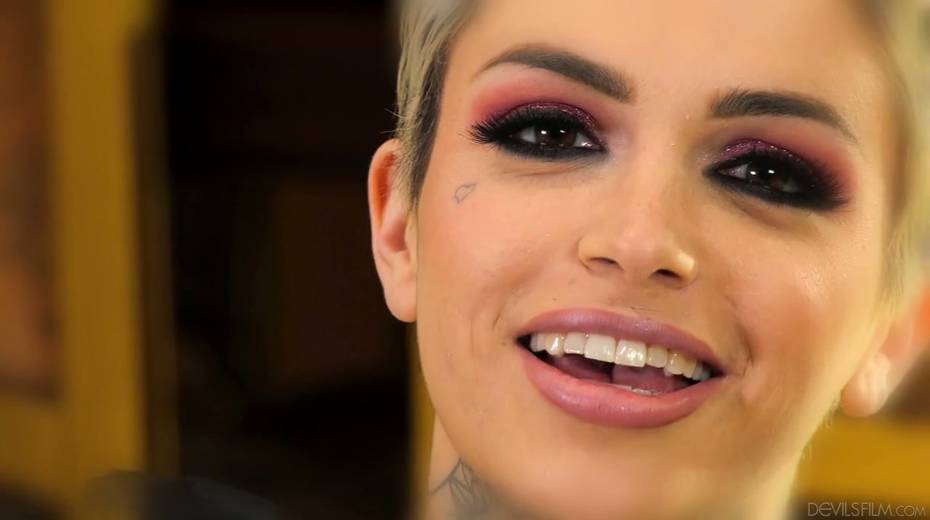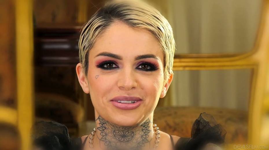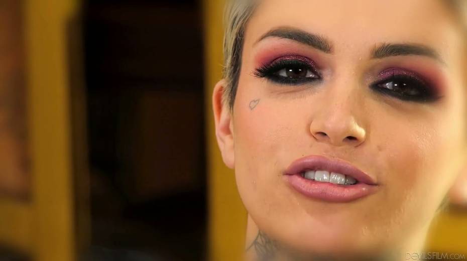Sexy tattooed hottie Leigh Raven gives interview before shooting