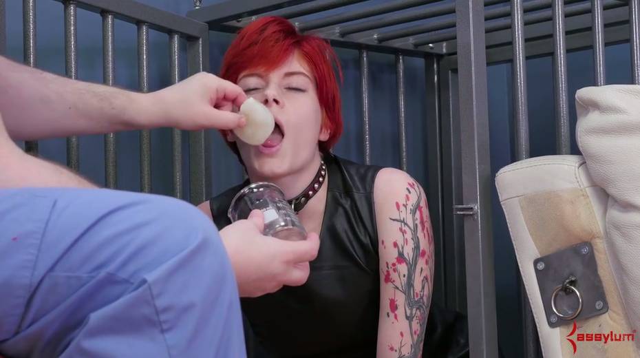 Tied up and suspended chick with red neon hair is face fucked before rough anal sex