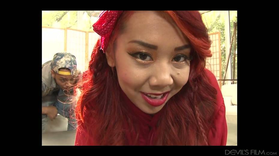 Red haired Asian chick Kimberly Chi gives a blowjob and gets her muff nailed