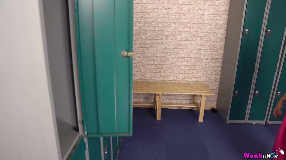 Naughty chick Georgie Newman is playing with suction cup dildo in the locker room