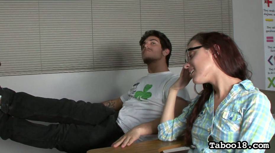 Mouth watering busty teacher shows Roxanne Rae how to suck big hard penis