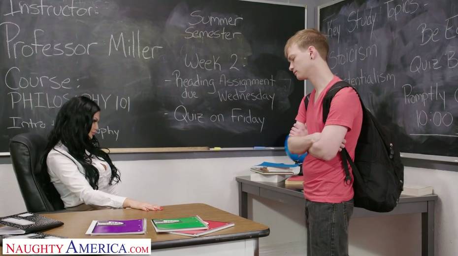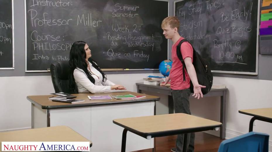 Gorgeous busty teacher Jasmine Jae spreads legs in front of her favorite student