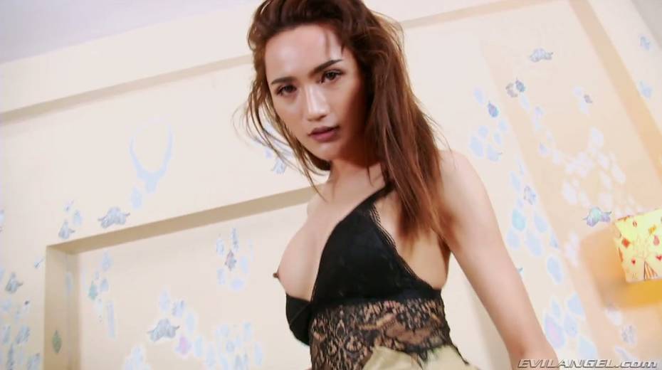 Exotic Thai shemale shows stretched butt hole and plays with hard dick