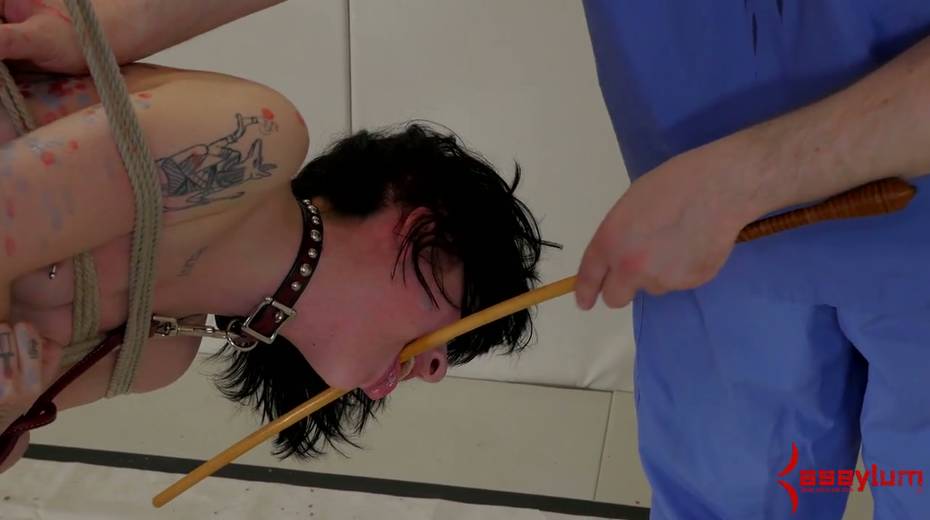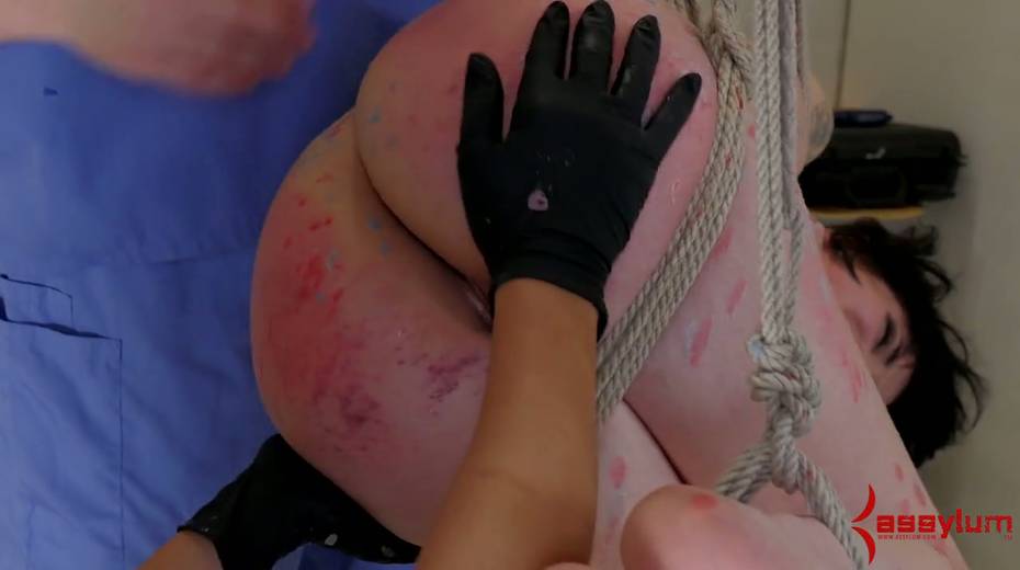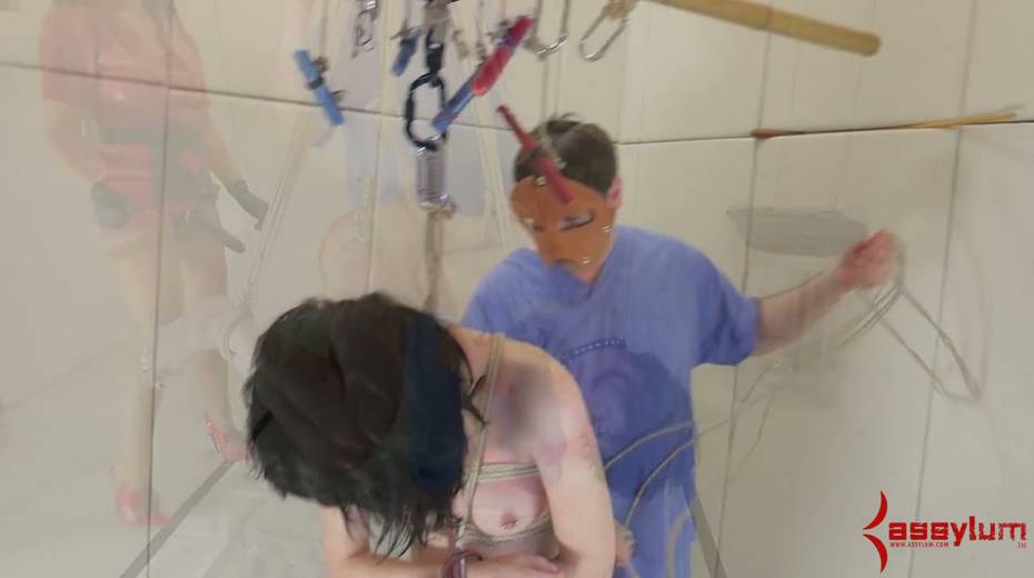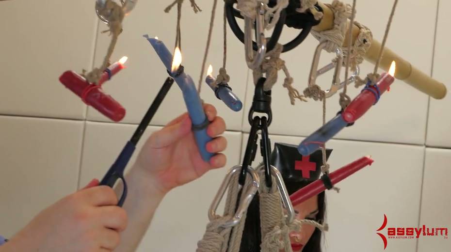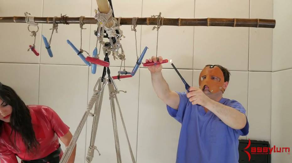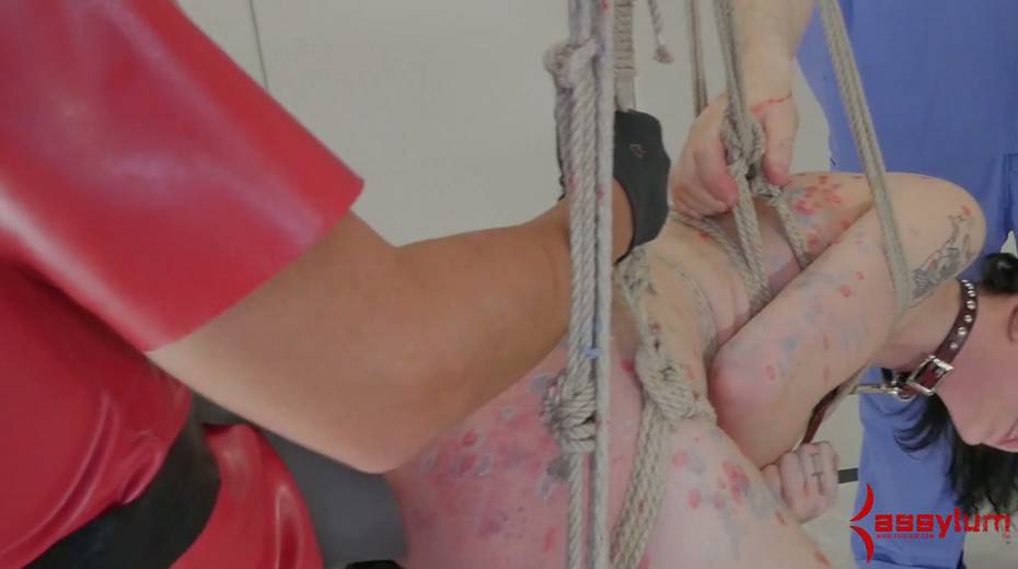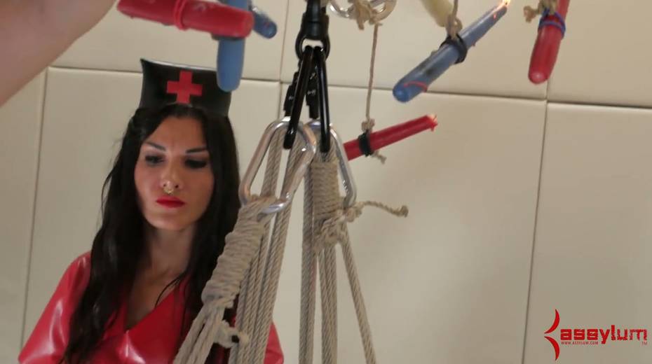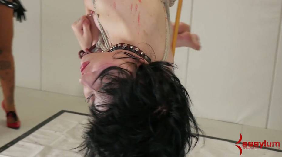 Horny mistress wearing strapon fucks tied up and suspended porn model