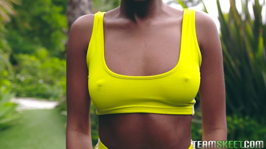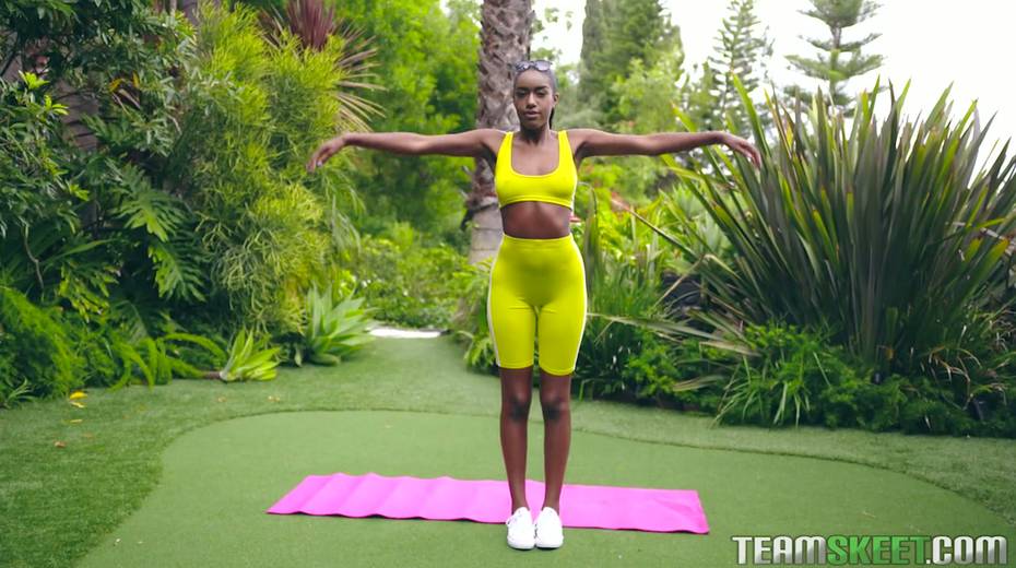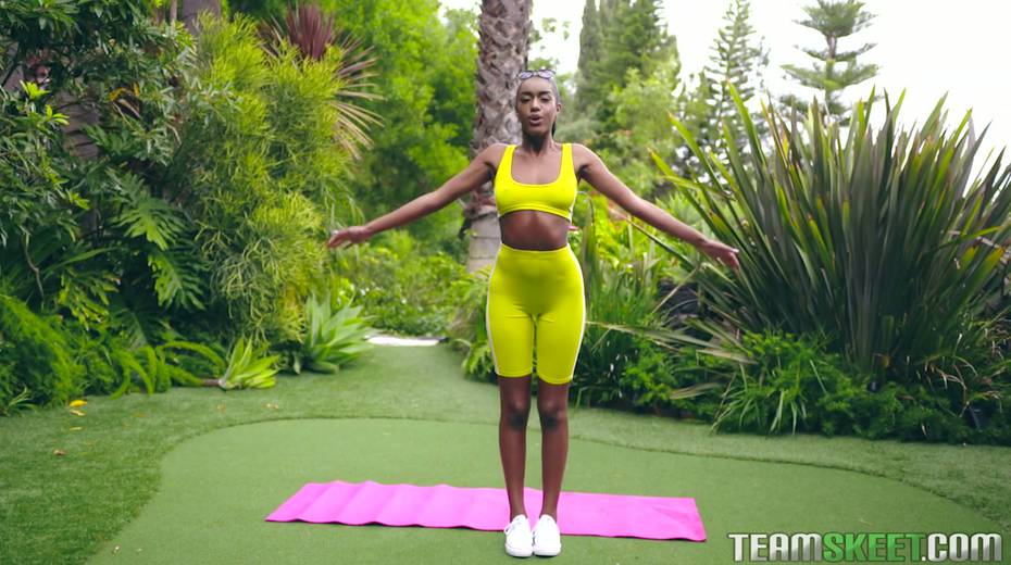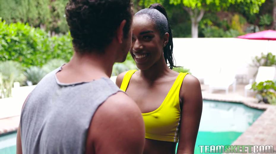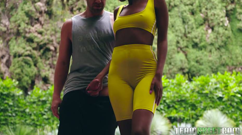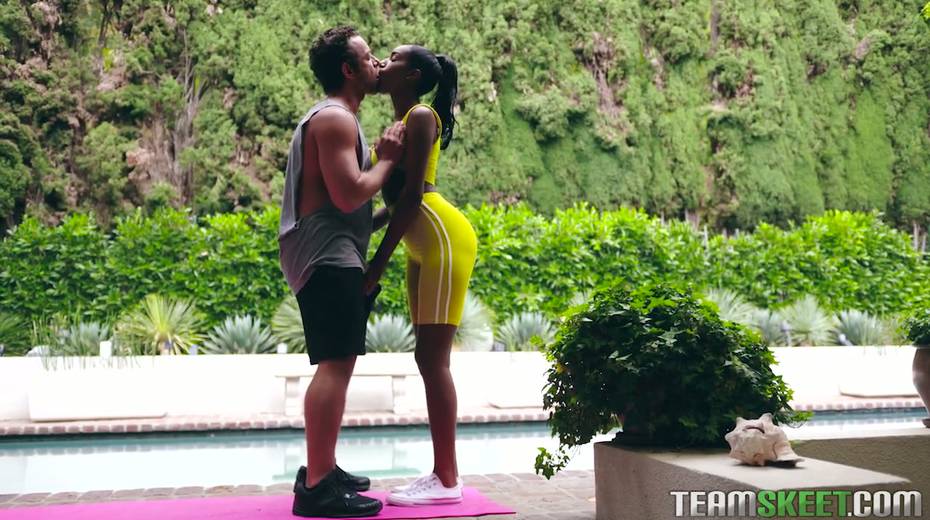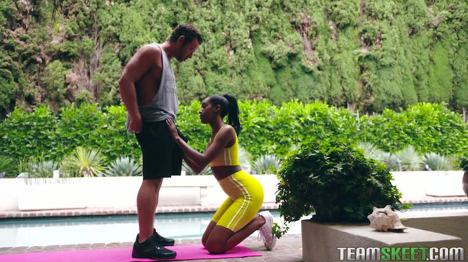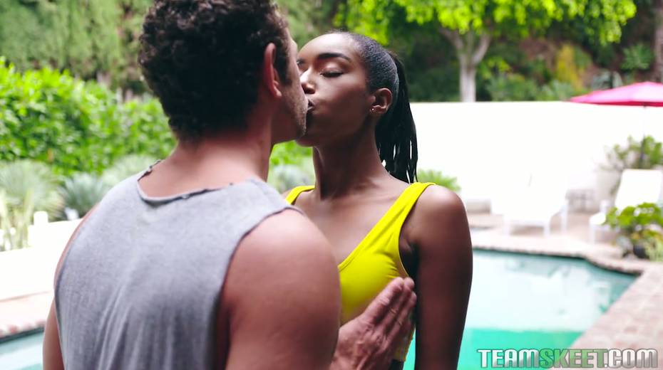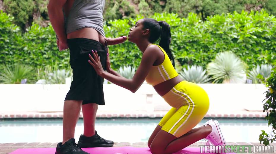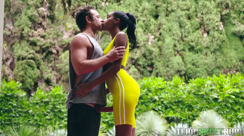 Sexy ebony babe Ashley Aleigh enjoys sucking big white dick and gets pussy nailed hard