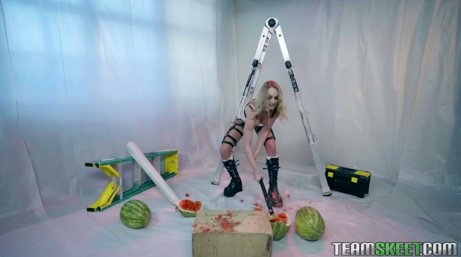 Crazy blond bitch Daisy Stone enjoys eating watermelon and cumshots