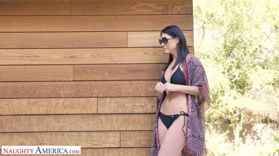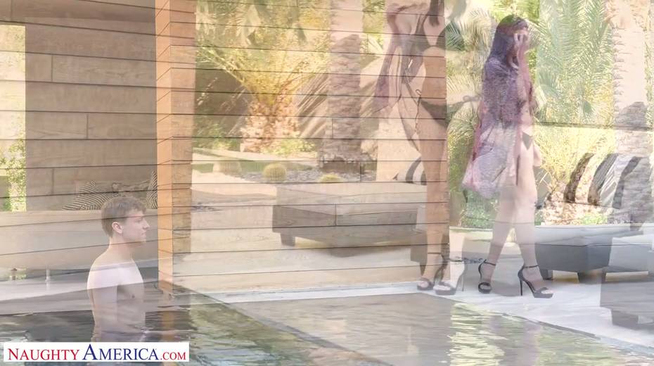 Lewd friend's mommy India Summer gives a blowjob and gets her slit fucked by the poolside