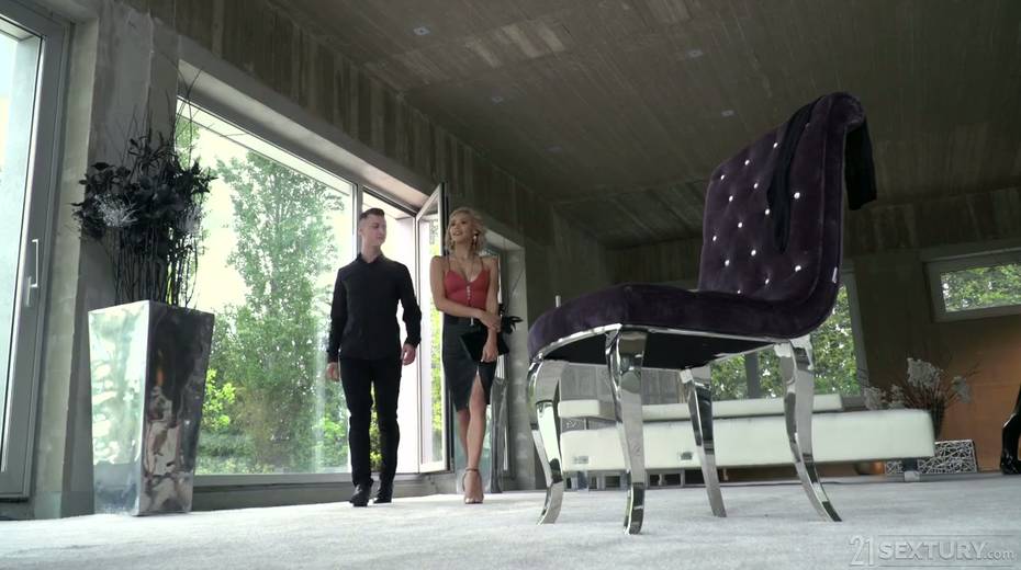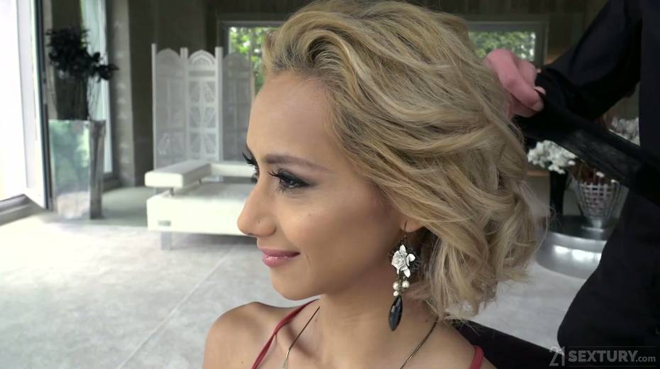 Blind folded blonde Veronica Leal gives a blowjob before a hardcore DP sex