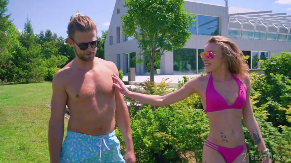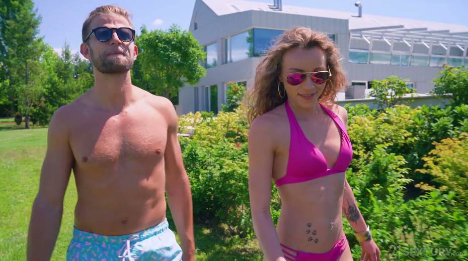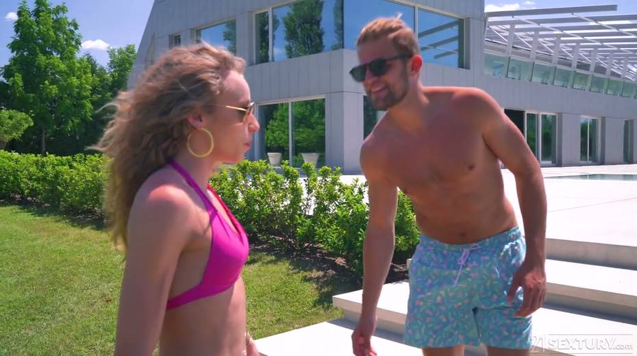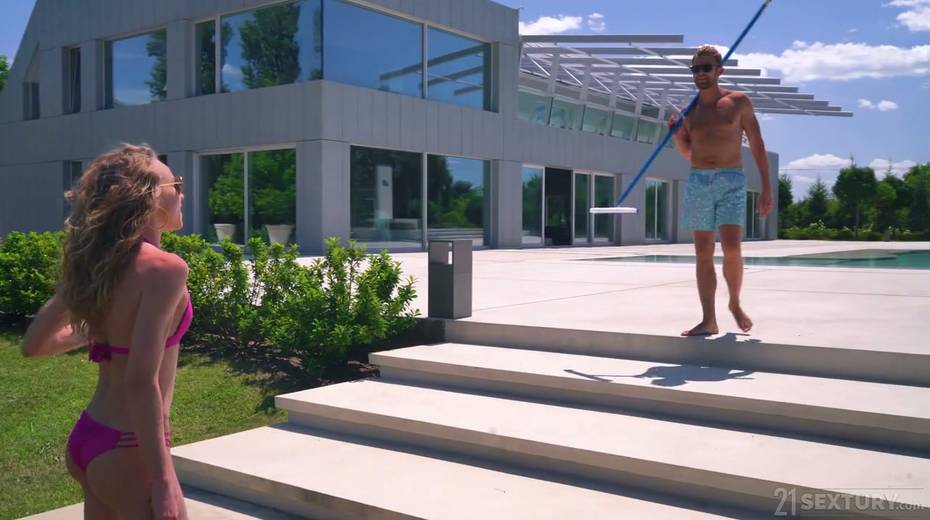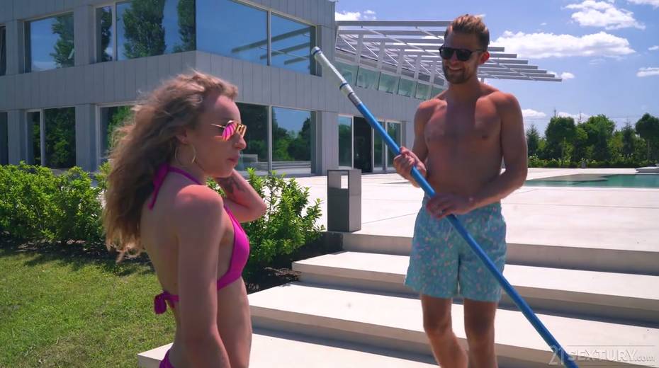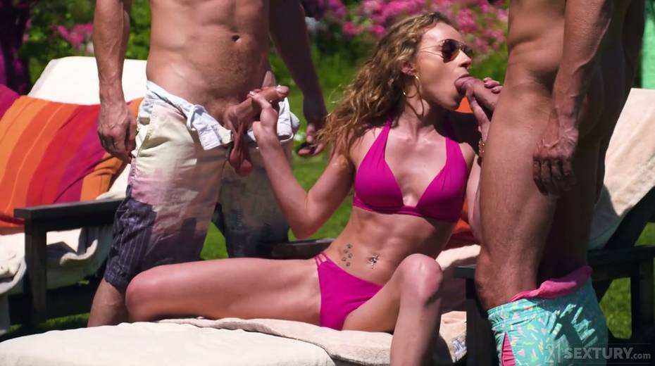 Two horny dudes fuck adorable blond chick Angel Emily by the poolside