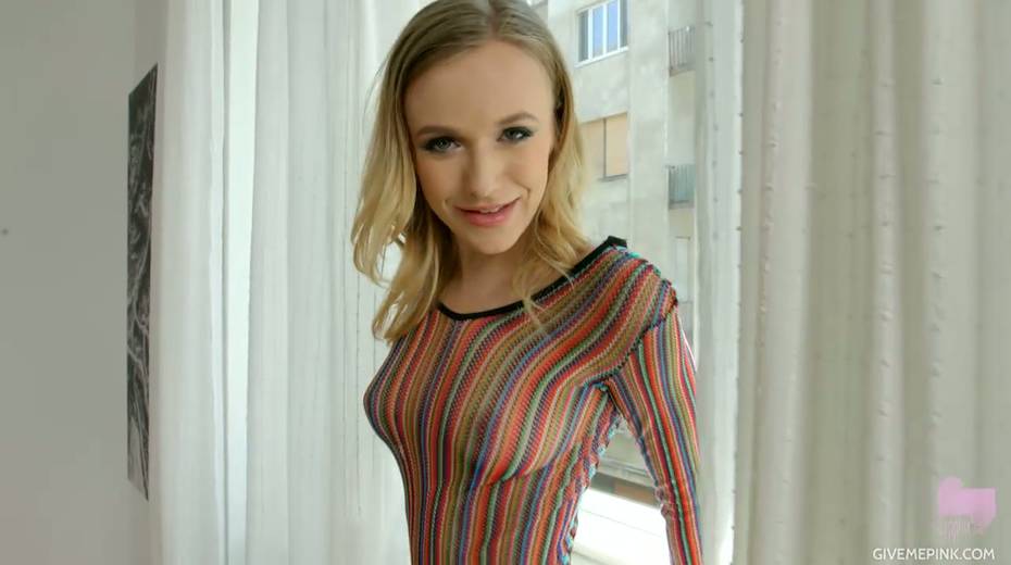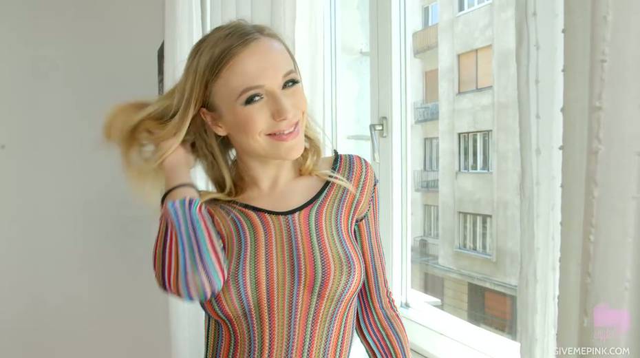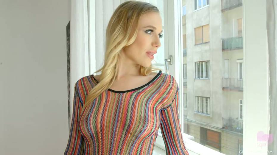 Glamorous blond lesbian Aislin is toying captivating smooth pussy spreading legs wide open