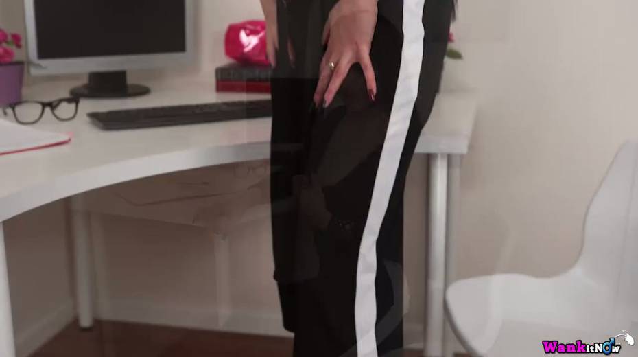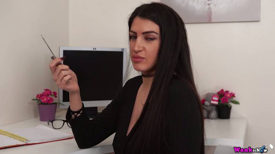 Office bitch in ripped fishnet body stockings Joanna teases with her boobs and snatch
