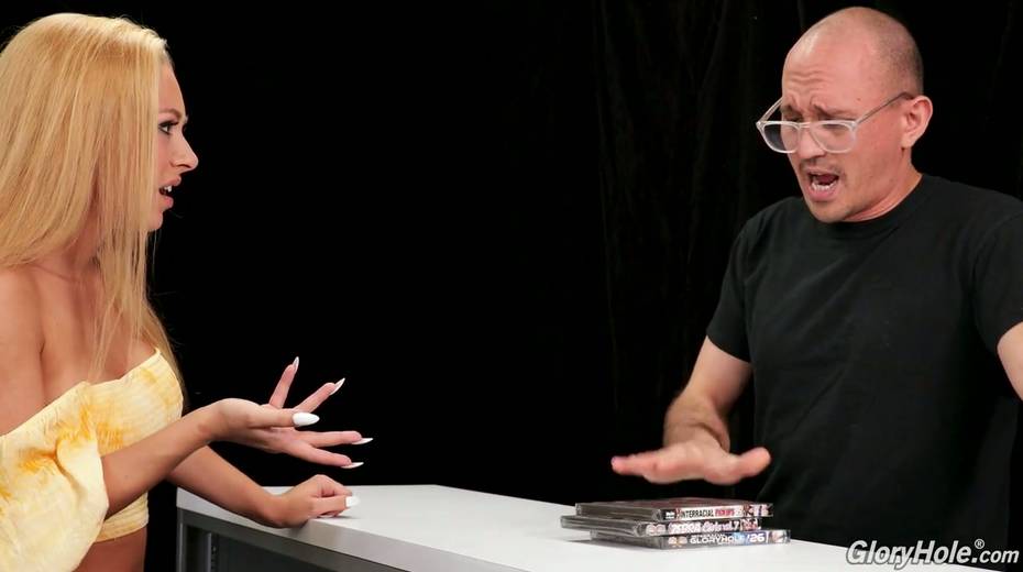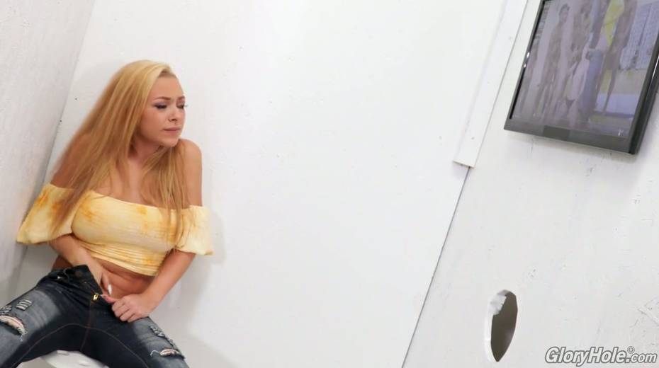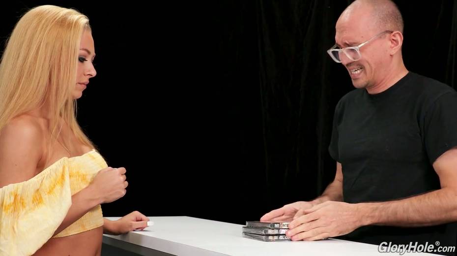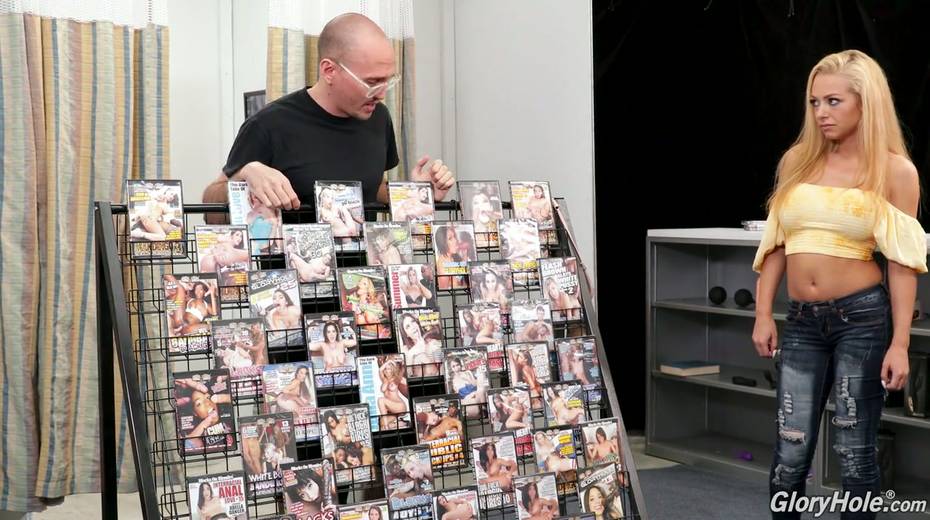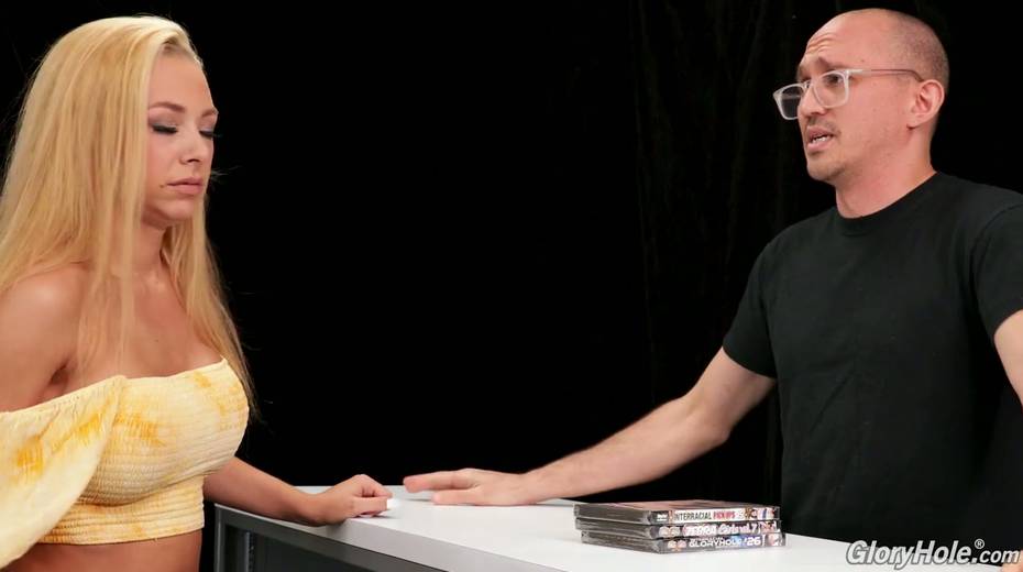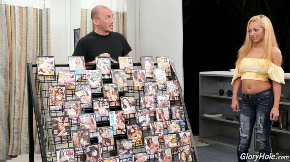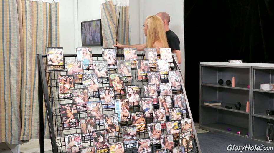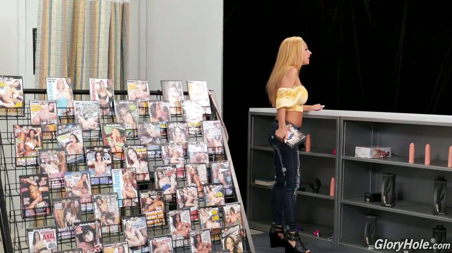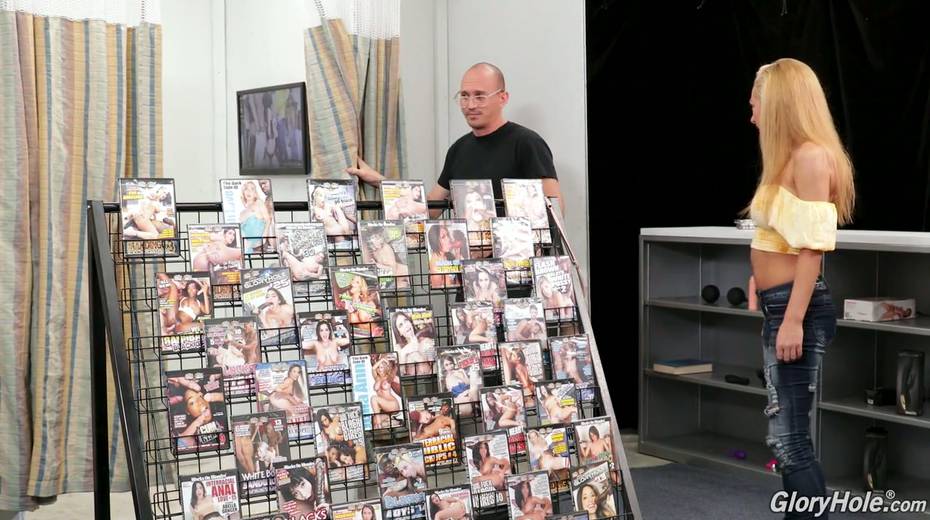 Sex shop seller invites busty blonde Honey Blossom to visit the glory hole room