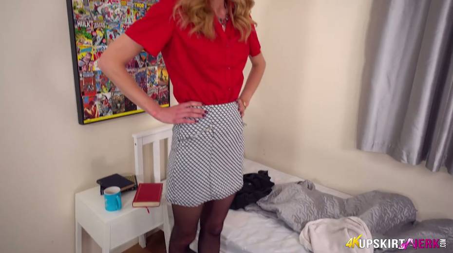 Sizzling red haired woman in stockings is flashing her panties upskirt