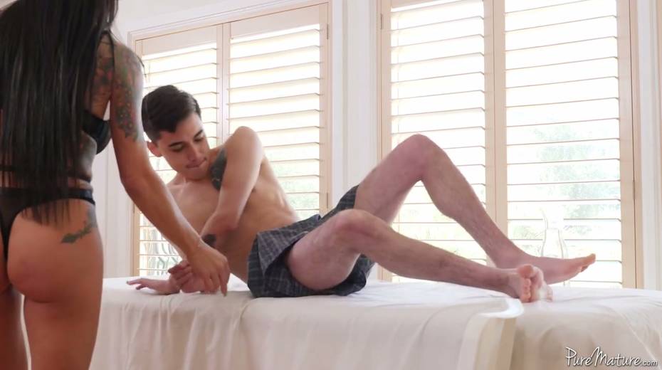 Gorgeous stepmom Melissa Lynn gives a nuru massage and bangs her stepson