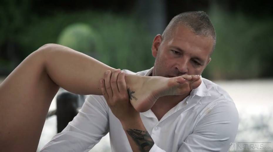 Unforgettable footjob by stunning blond babe with sexy legs Nicole Brix