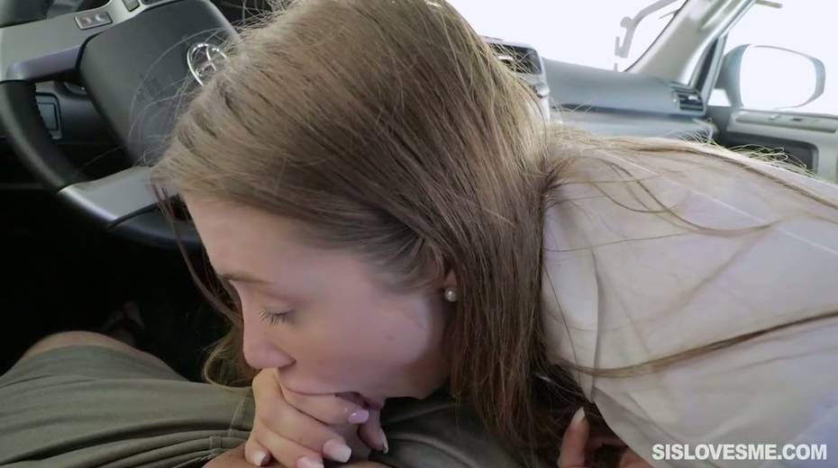 Shy stepsister Audrey Hempburne gives a good blowjob in the car instead of college